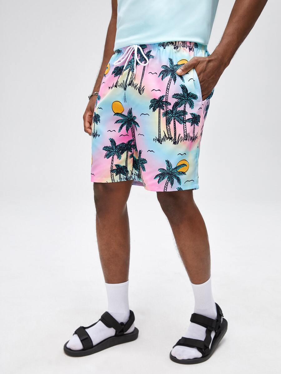 Street Life Men Ombre Coconut Tree Print Drawstring Waist Shorts, School