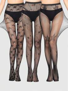 Goth Halloween 3pcs Random Pentagram Pattern Y2K Fishnet Stockings, Sexy Starry Tight Pantyhose, Suitable For Daily Wear, Party And Dance Tight Stockings