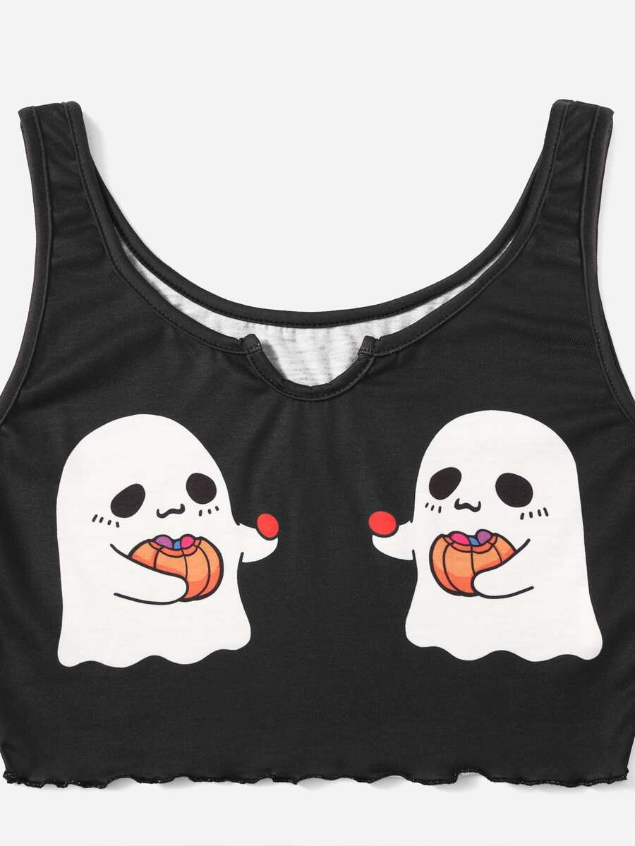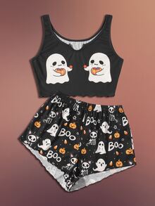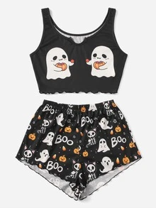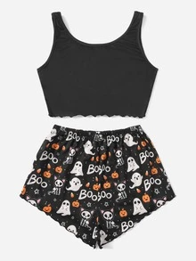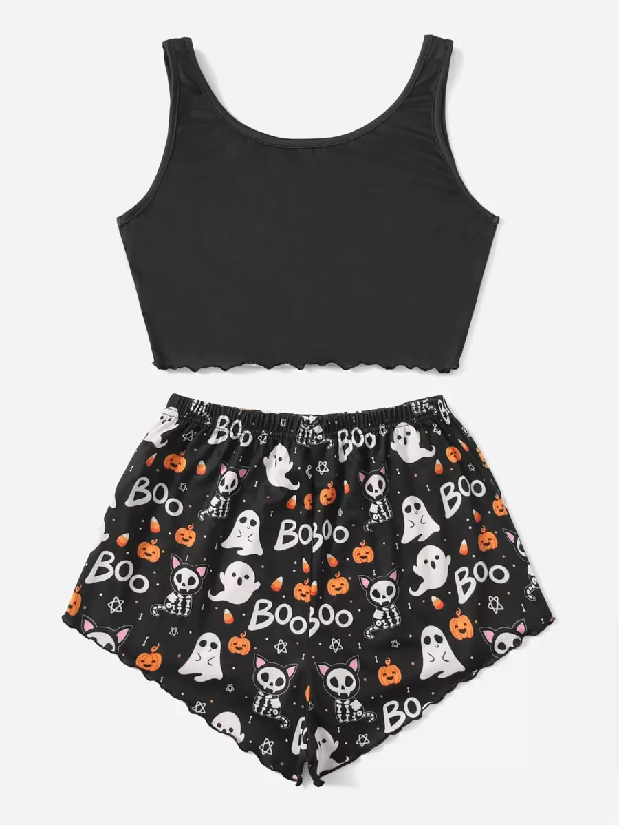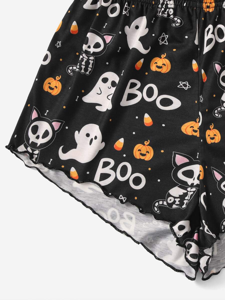 Halloween Letter Cartoon Graphic Lettuce Trim Pajama Set