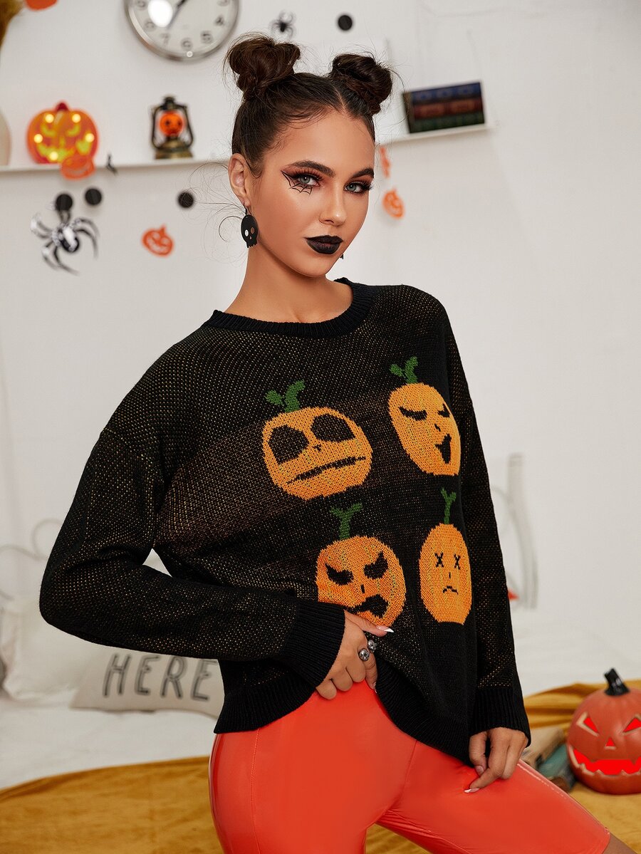 Halloween Pumpkin Pattern Drop Shoulder Sweater