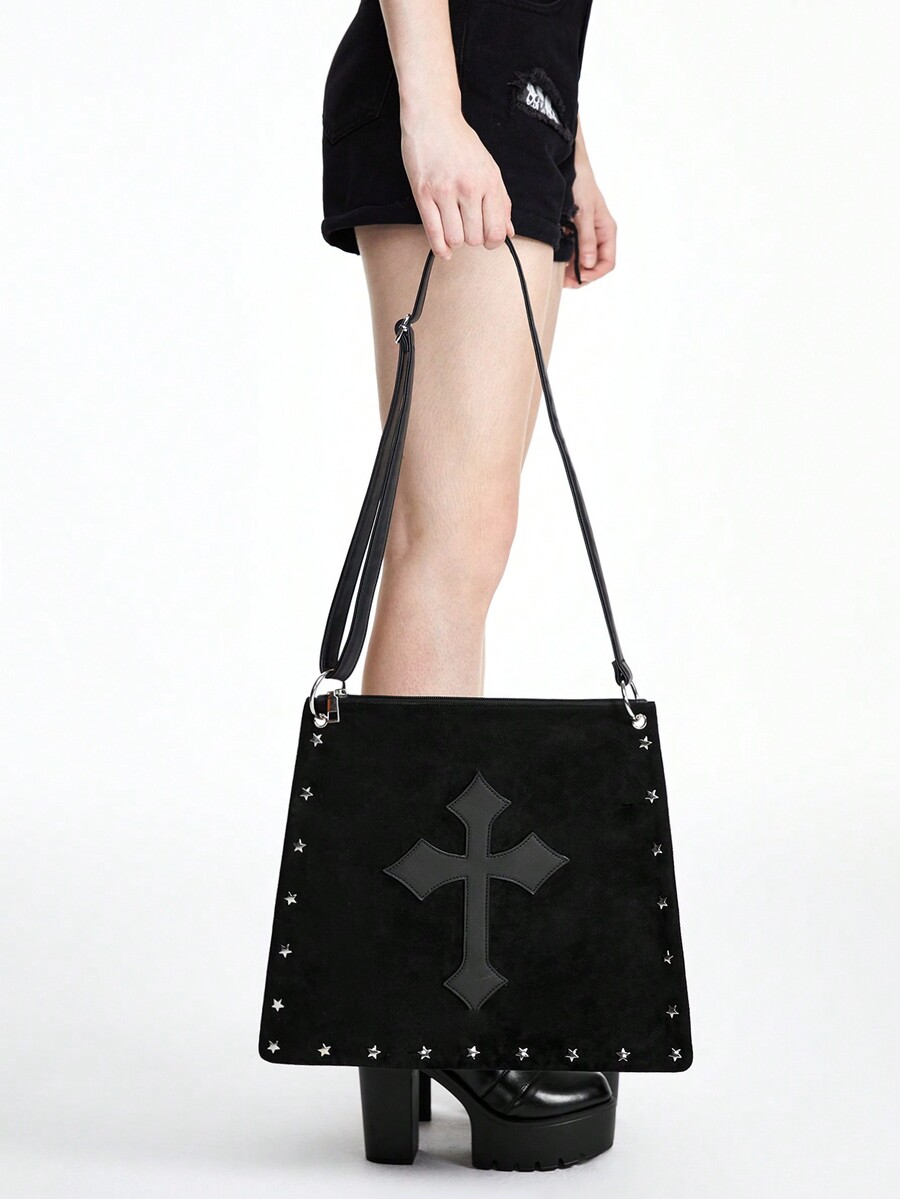 Halloween Punk Gothic Cross Faux Suede Black Pentagram Rivet Crossbody Shoulder Bag