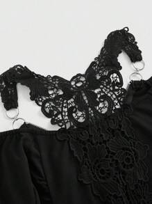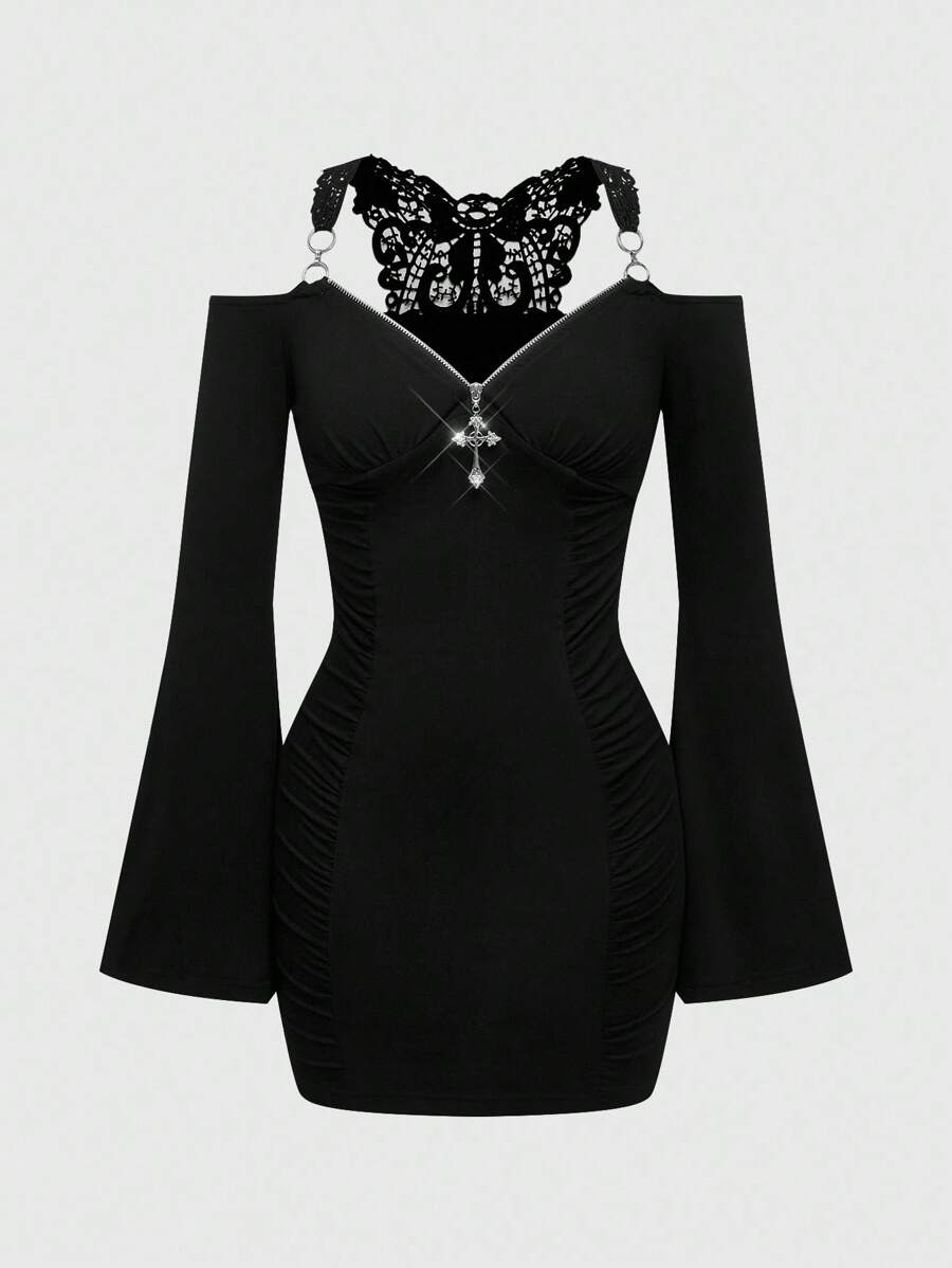 Goth Halloween Women Dress Vintage Y2K Versatile Cross Decor Patchwork Ruched Waist Off Shoulder Flare Sleeve Bodycon Mini Dress For Women