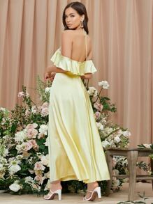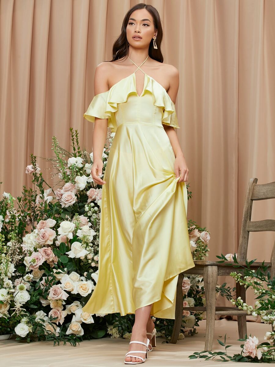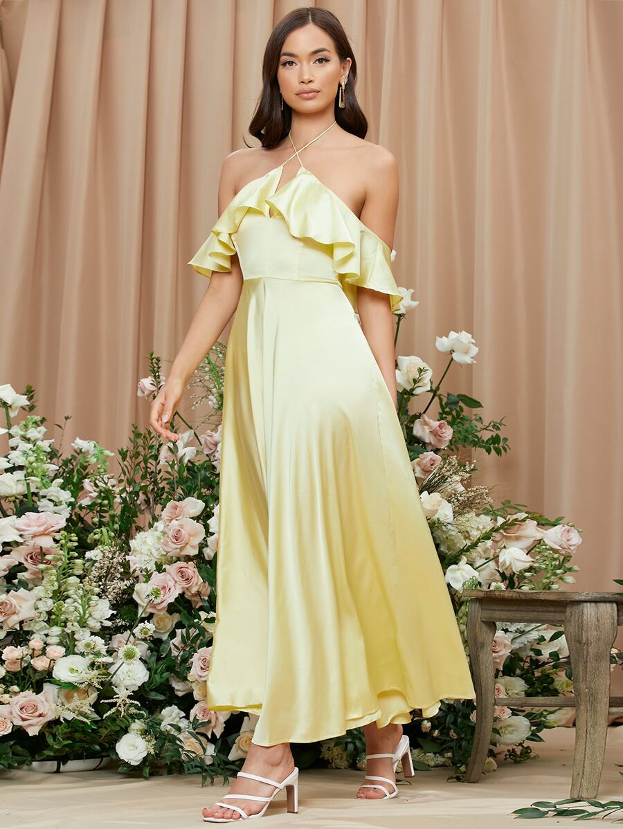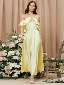 Halter Off Shoulder Ruffle Detail Satin Dress