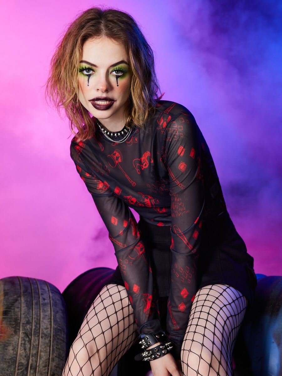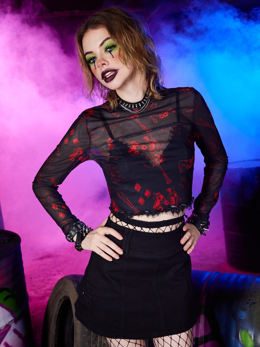 Harley Quinn | ROMWE Casual Mesh Printed See Through Long Sleeve Slim Fit Women's Top