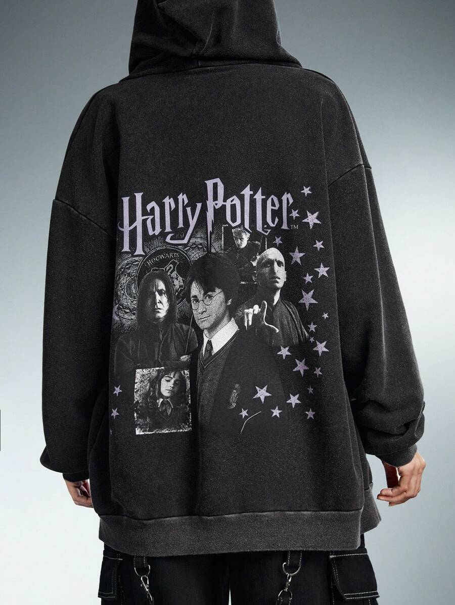 Harry Potter | ROMWE Women Black Figure And Letter Graphic Zipper Up Drawstring Hoodie Washed Distressed Sweatshirt