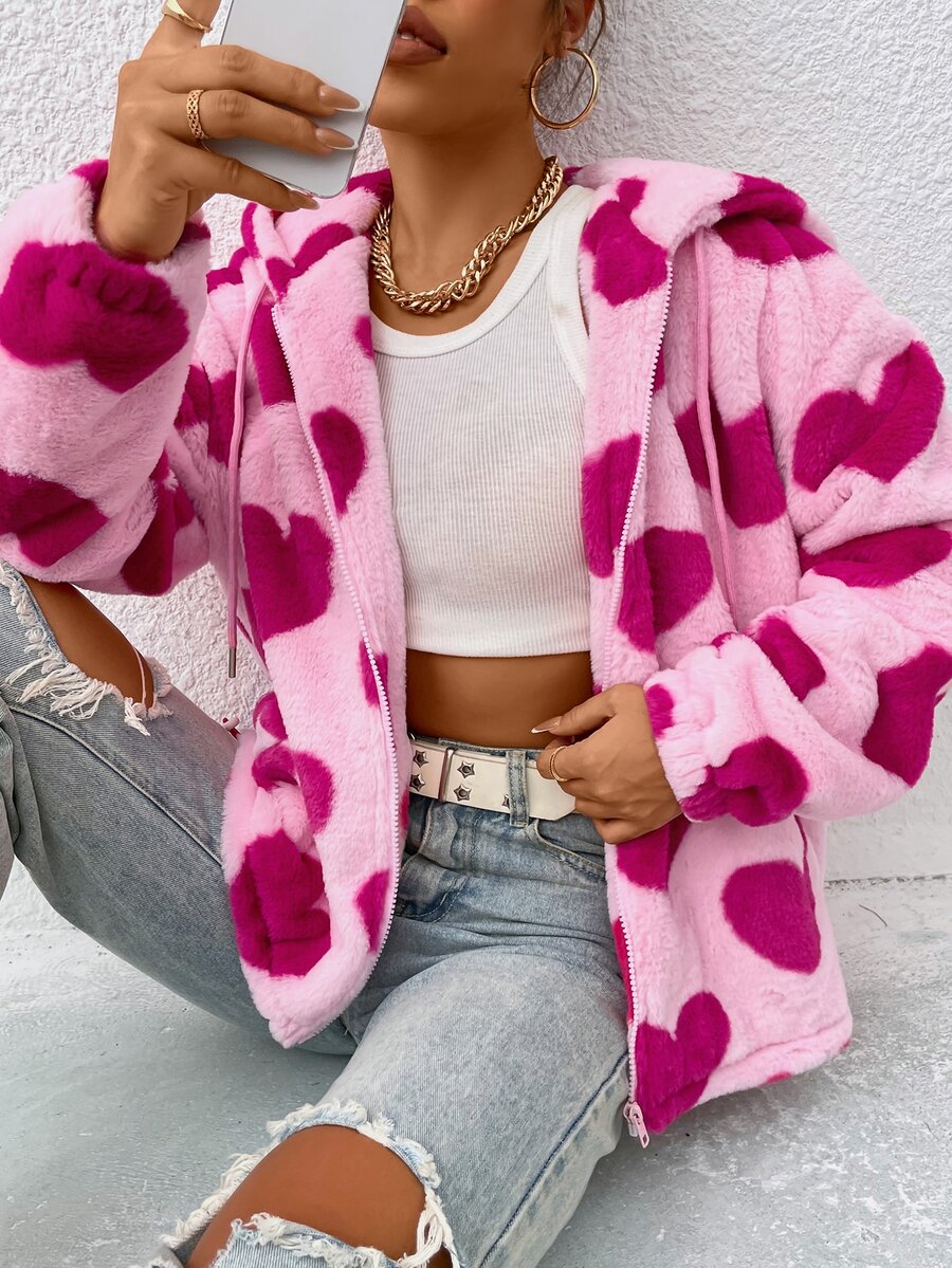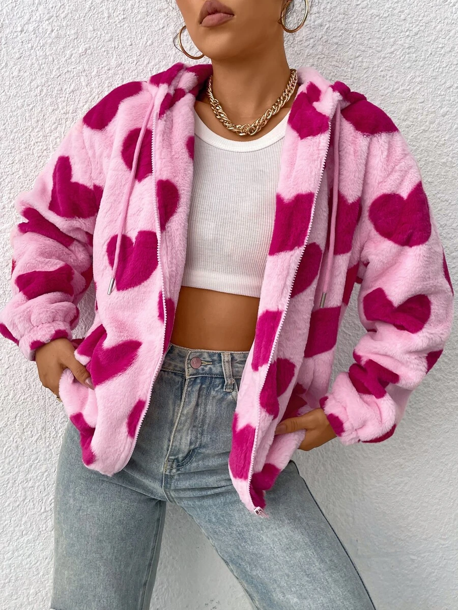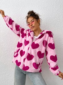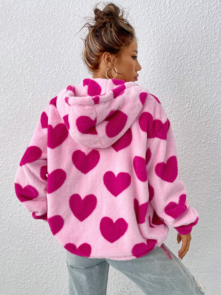 Heart Pattern Drop Shoulder Drawstring Hooded Coral Fleece Jacket