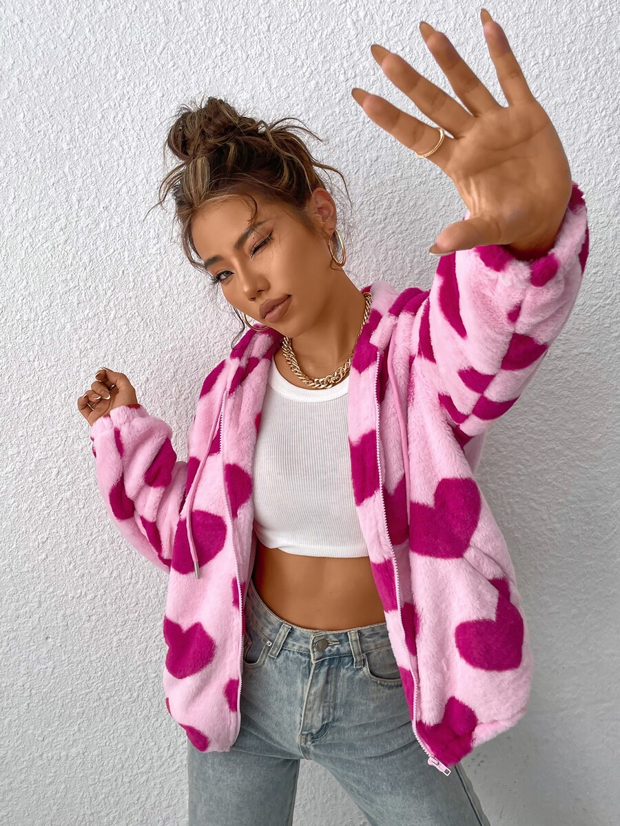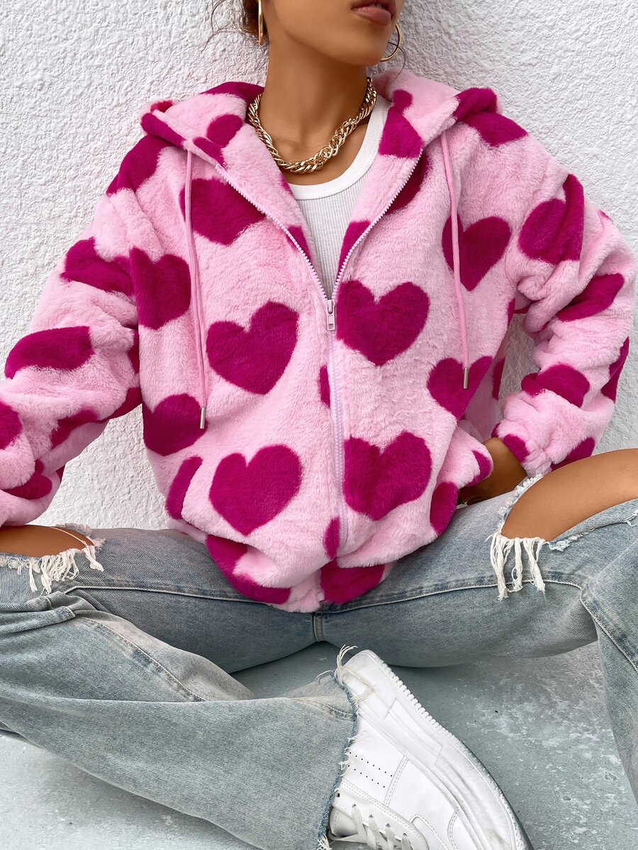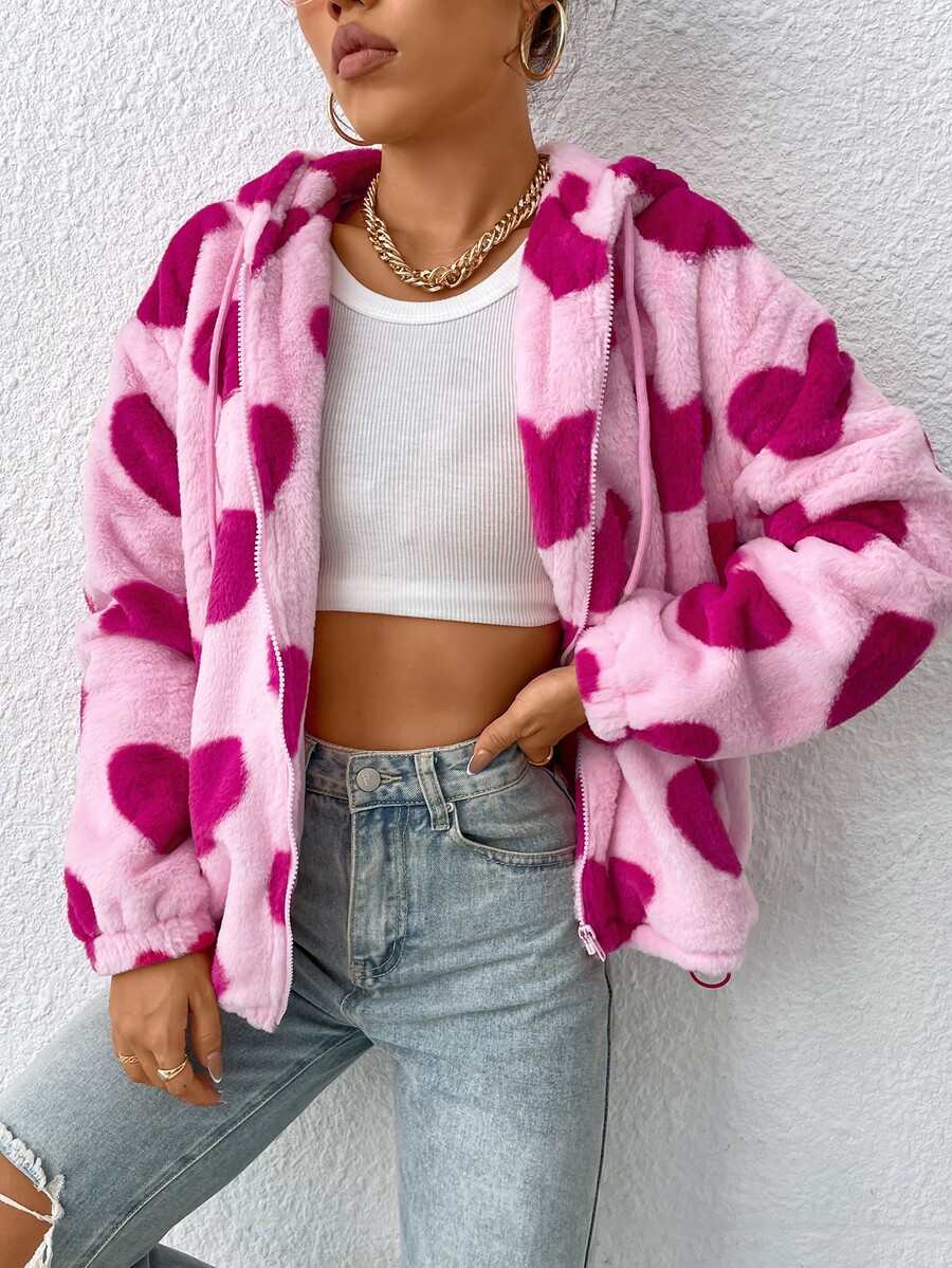 Heart Pattern Drop Shoulder Drawstring Hooded Coral Fleece Jacket