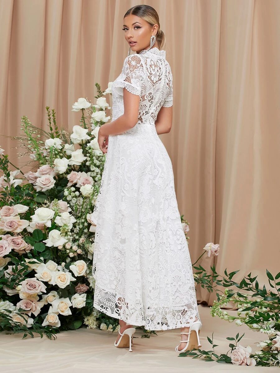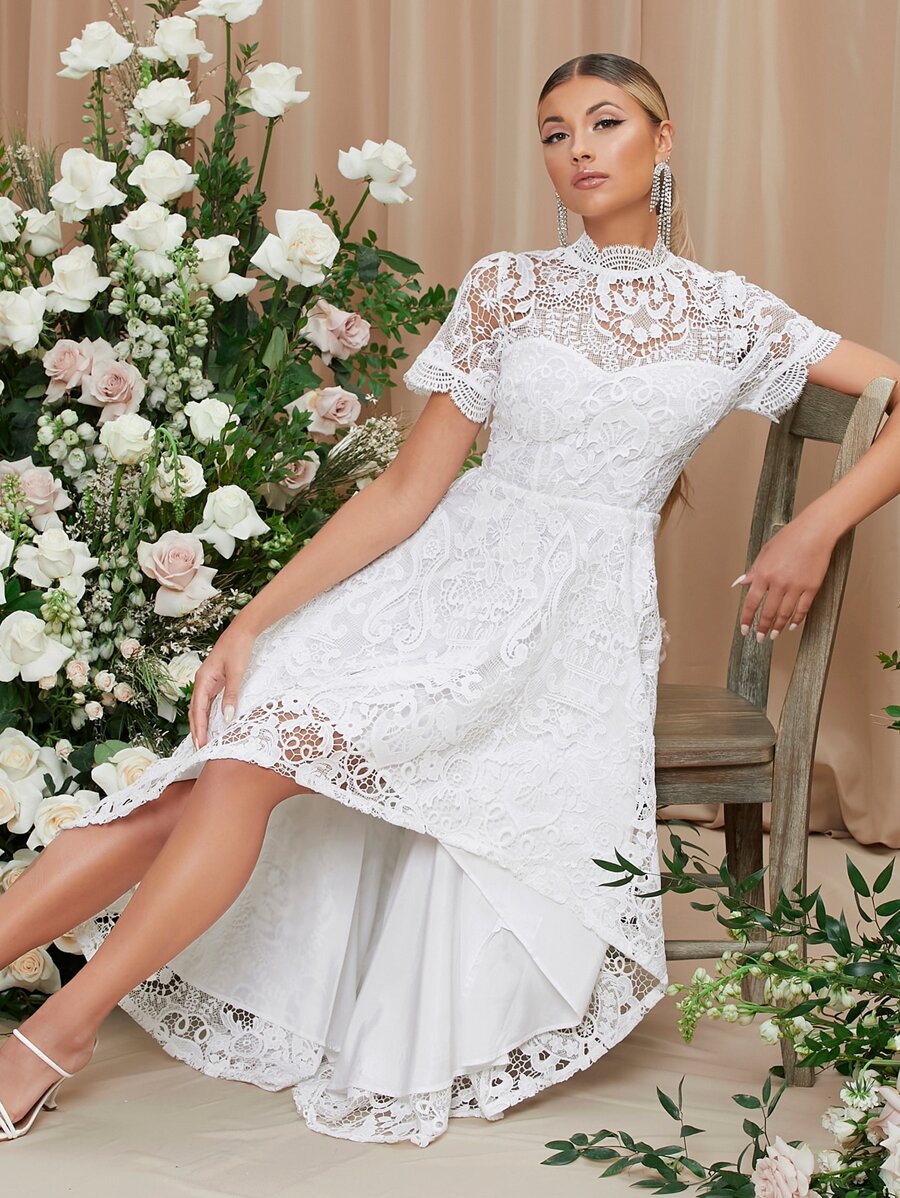 High Low Mock Neck Lace Yoke Dress
