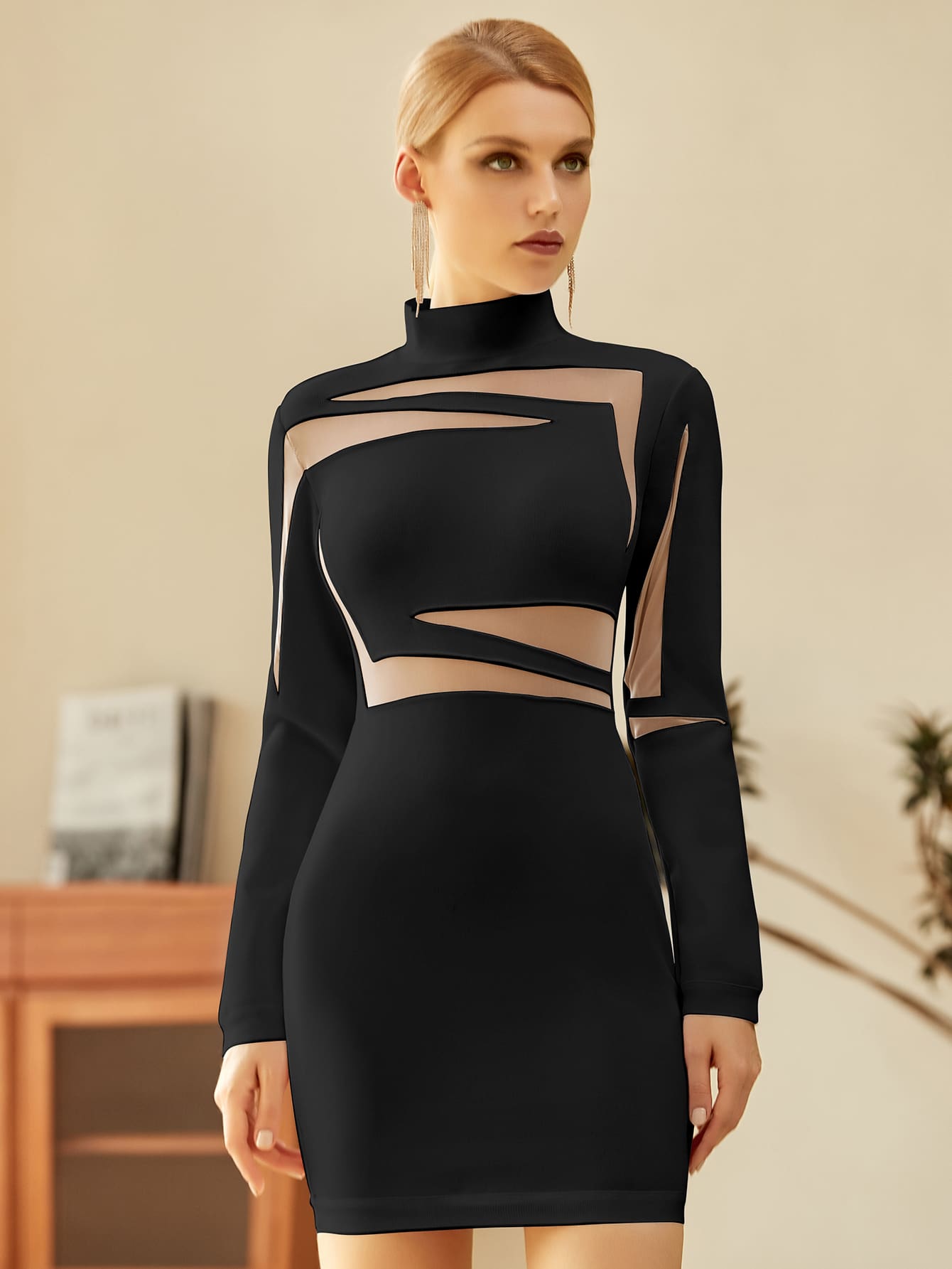 High Neck Zipper Back Sheer Mesh Insert Bandage Dress