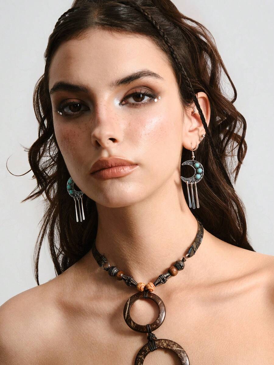 Hippie 2pcs/Set Vintage Boho Turquoise Crescent Moon Tassel Pendant Earrings For Women