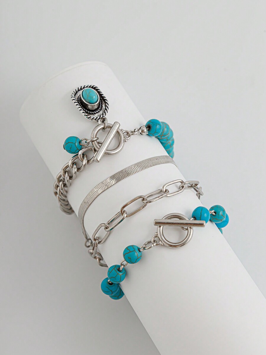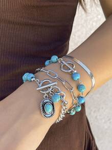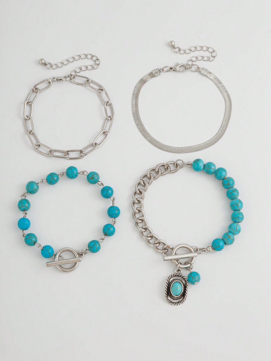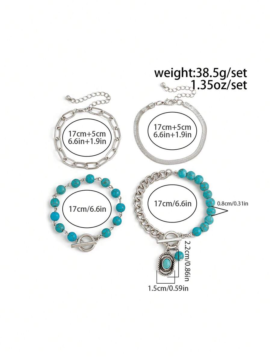 Hippie 4pcs Stylish Western Cowboy Style Turquoise Beaded Bracelet Set With Cowboy Hat Decoration
