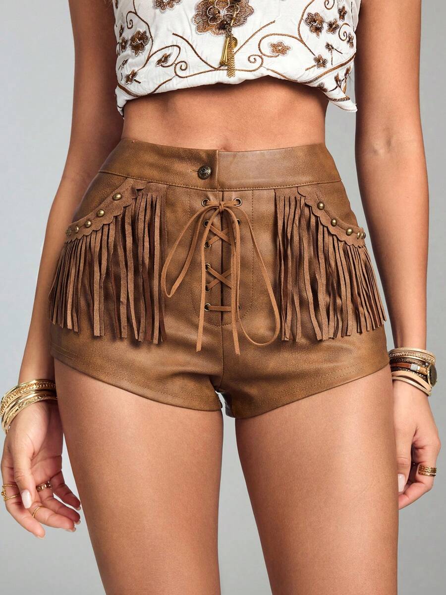 Hippie Chic Vacation Casual Music Festival Party Low Waist Mini PU Leather Fringe Super Short Shorts