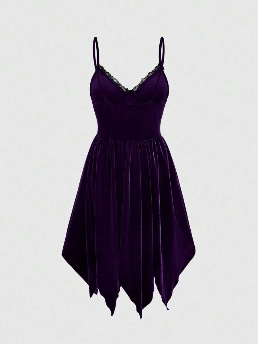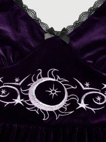 Hippie Dark Gothic Star And Moon Embroidery Velvet Asymmetrical Hem Cami Dress