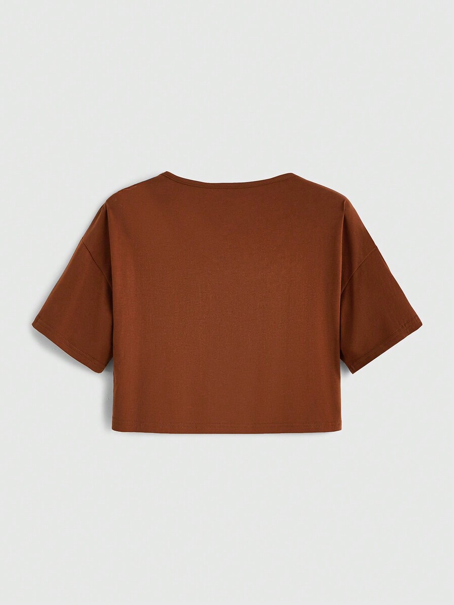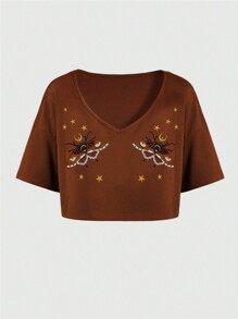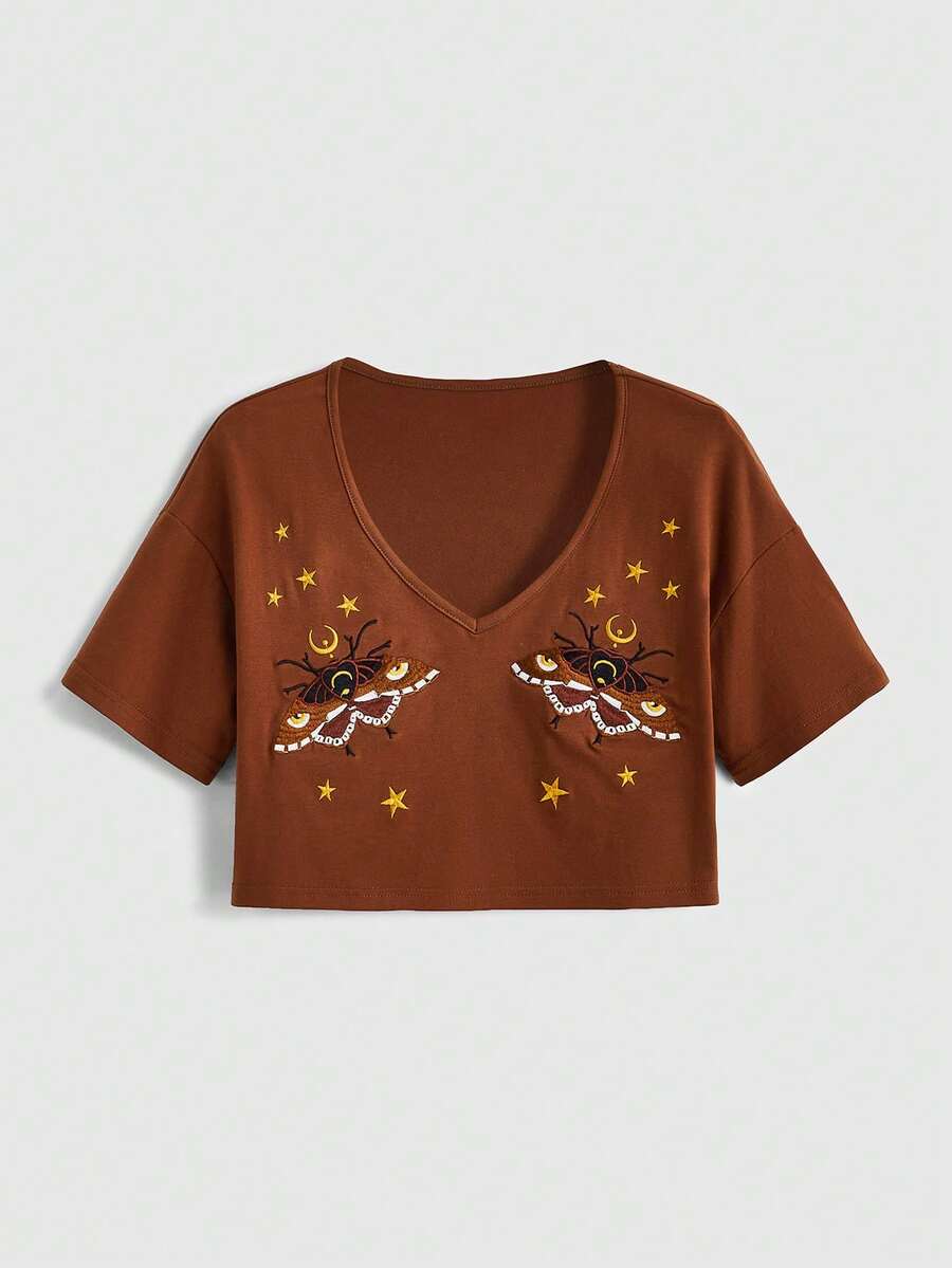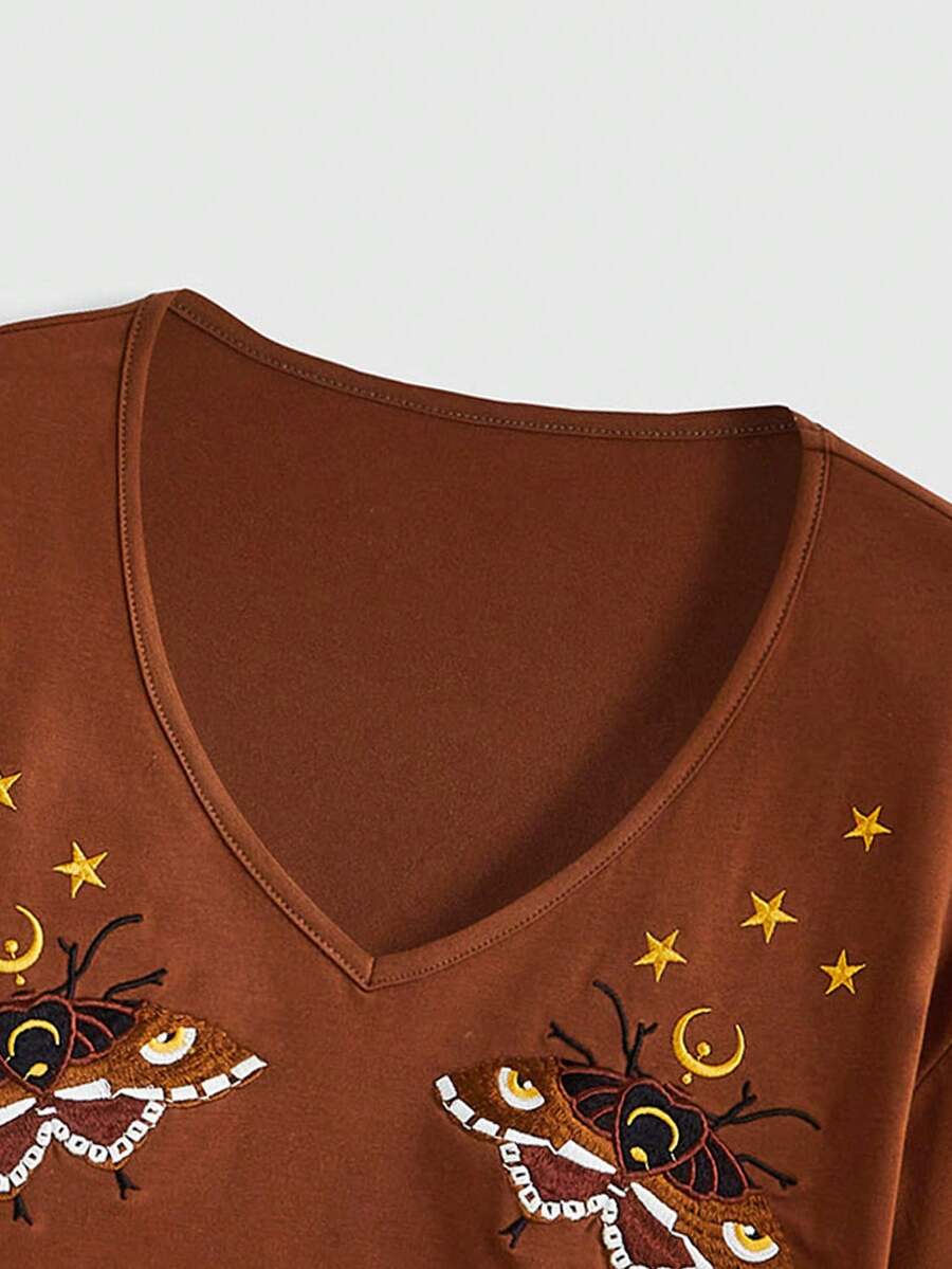 Hippie Embroidered Moths, Sun, Moon, And Stars V-Neck Cropped Loose T-Shirt