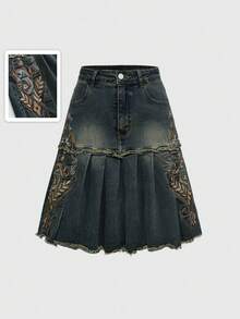 Hippie Chic Vintage Embroidered High Waisted Knee-Length Tiered Ruffle Hem Boho Denim Skirt
