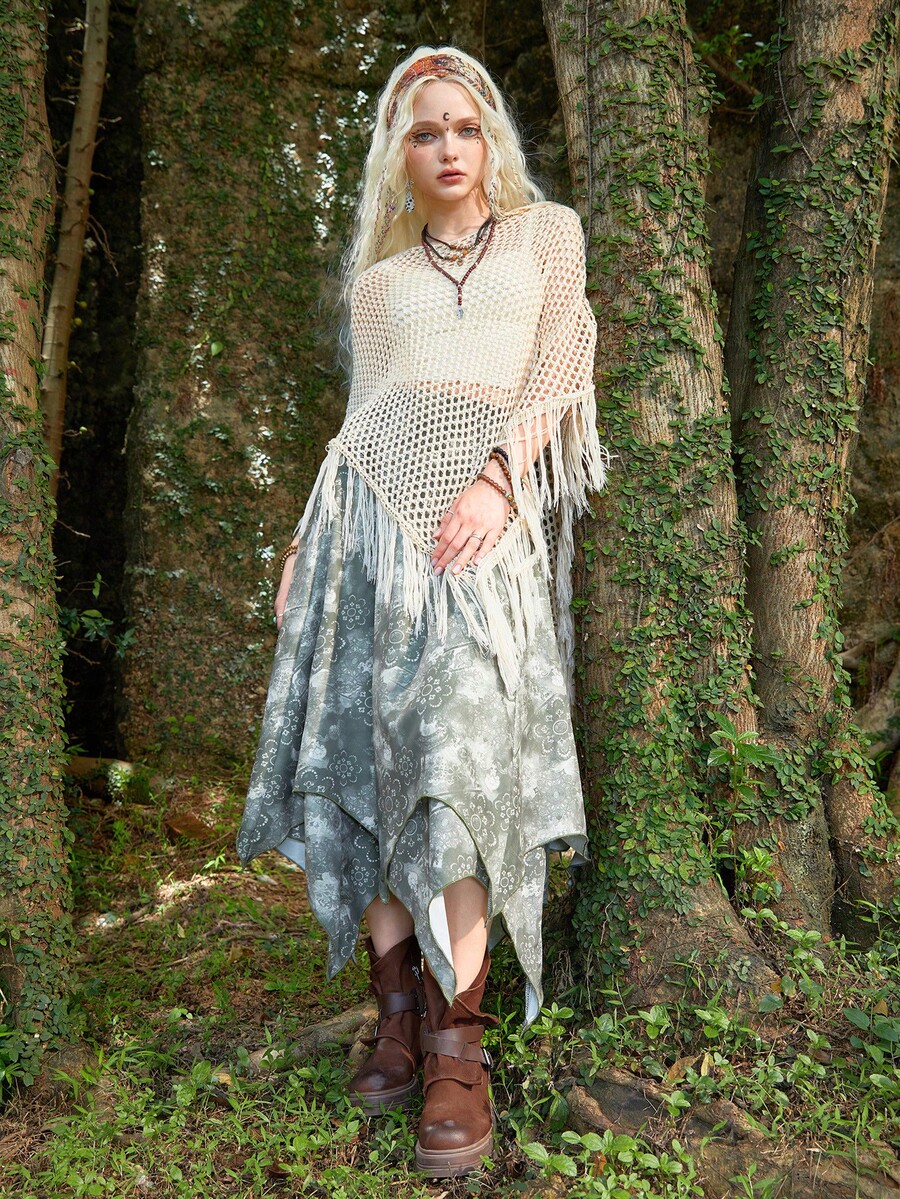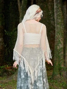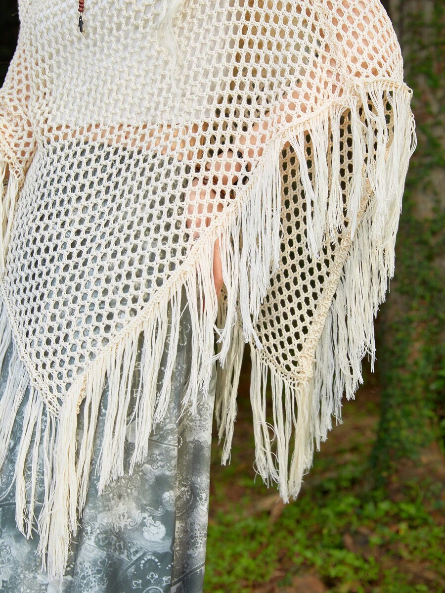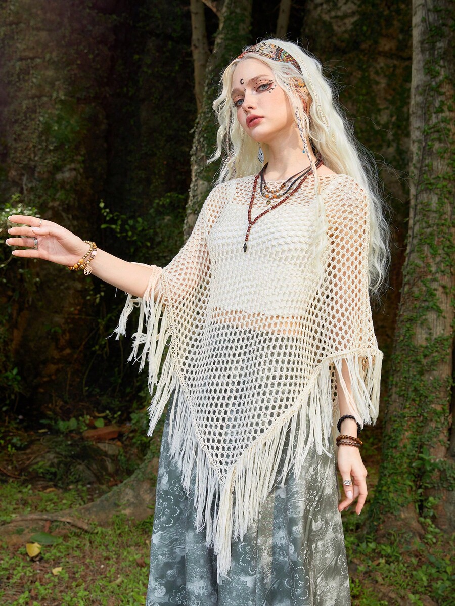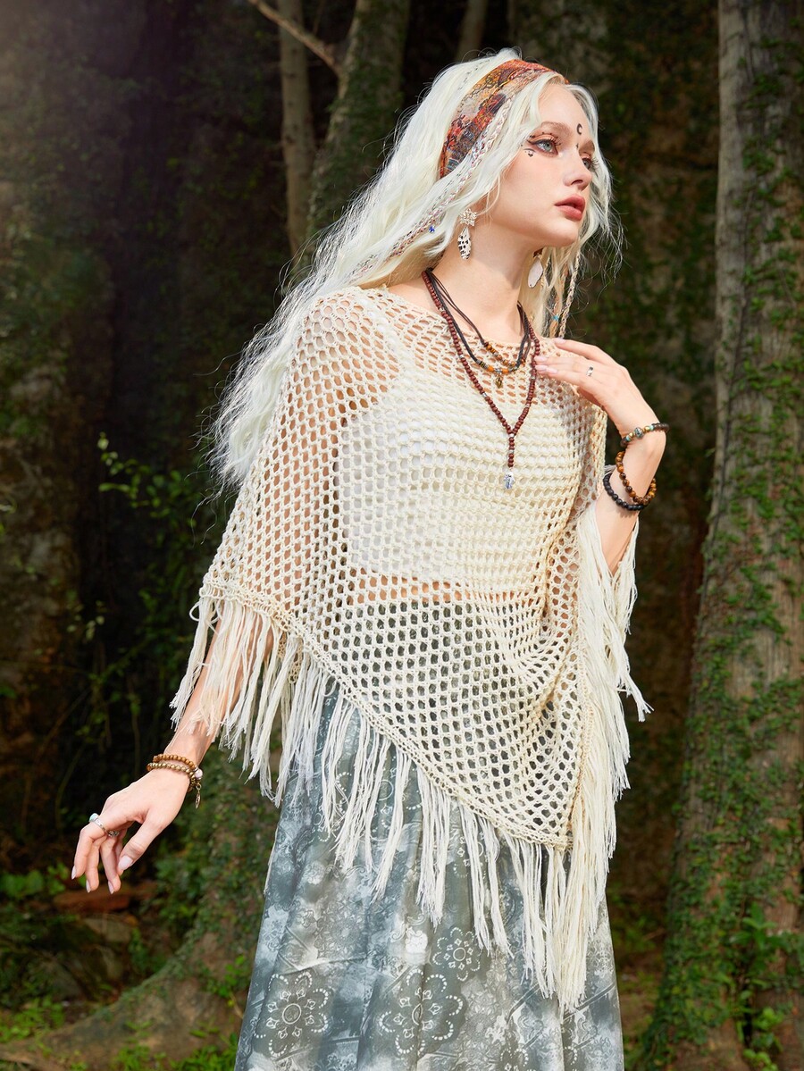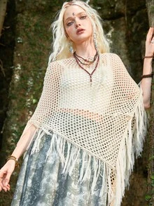 Hippie Hollow Out Fringe Hem Knit Poncho