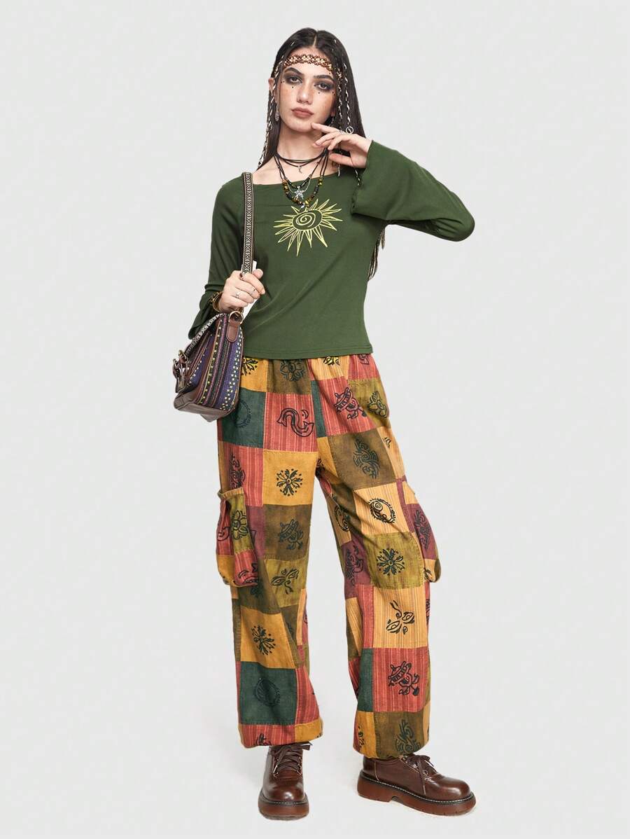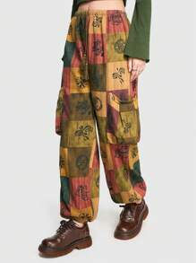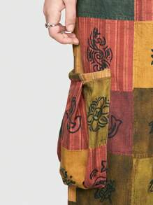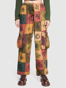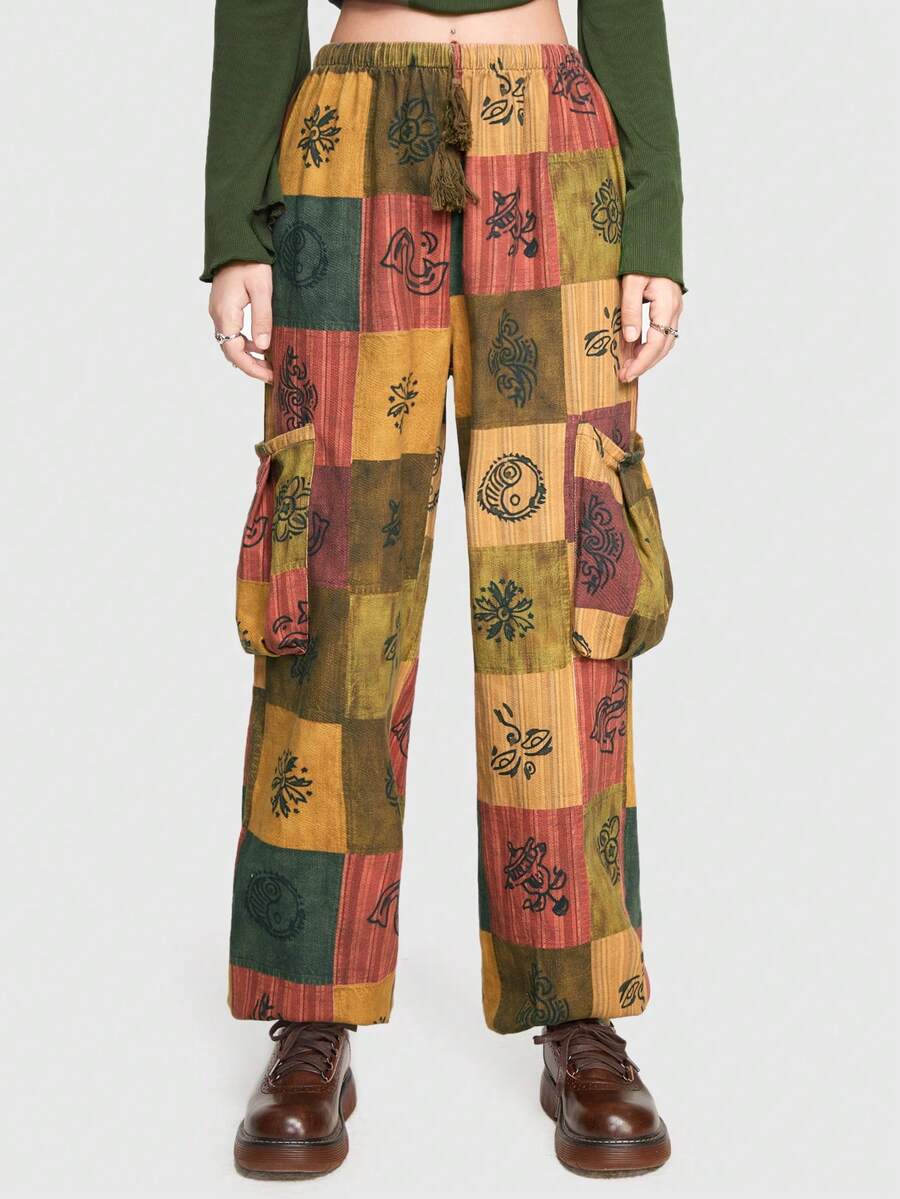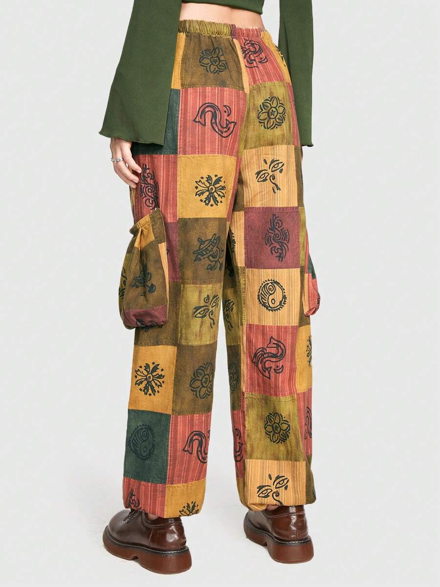Hippie Patchwork Print Flap Pocket Side Cargo Pants
