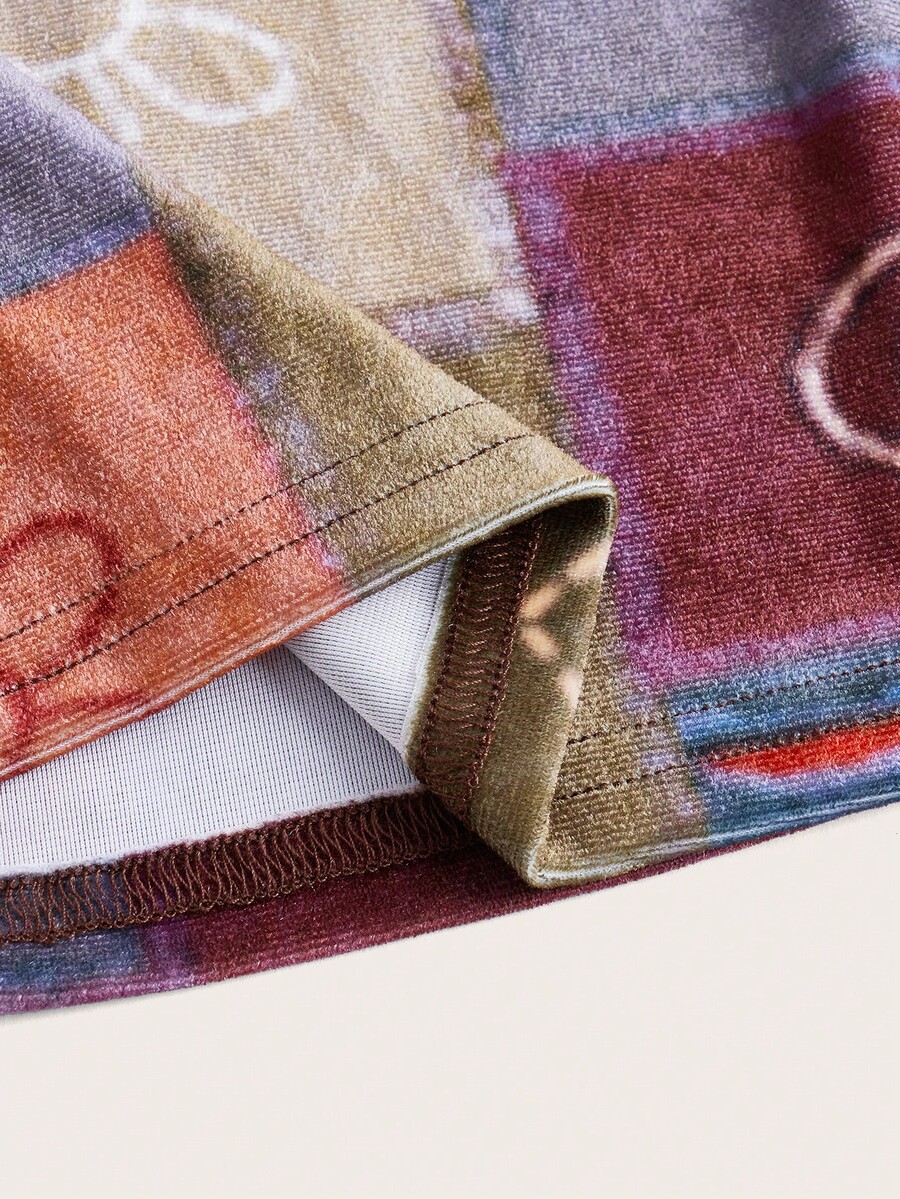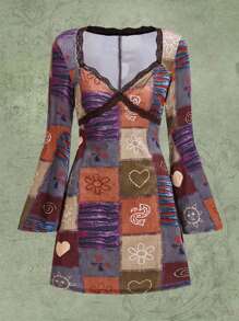 Hippie Patchwork Print Lace Trim Flare Sleeve Bodycon Dress