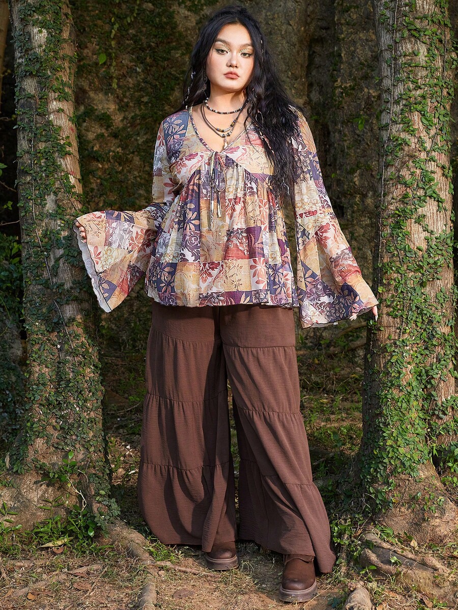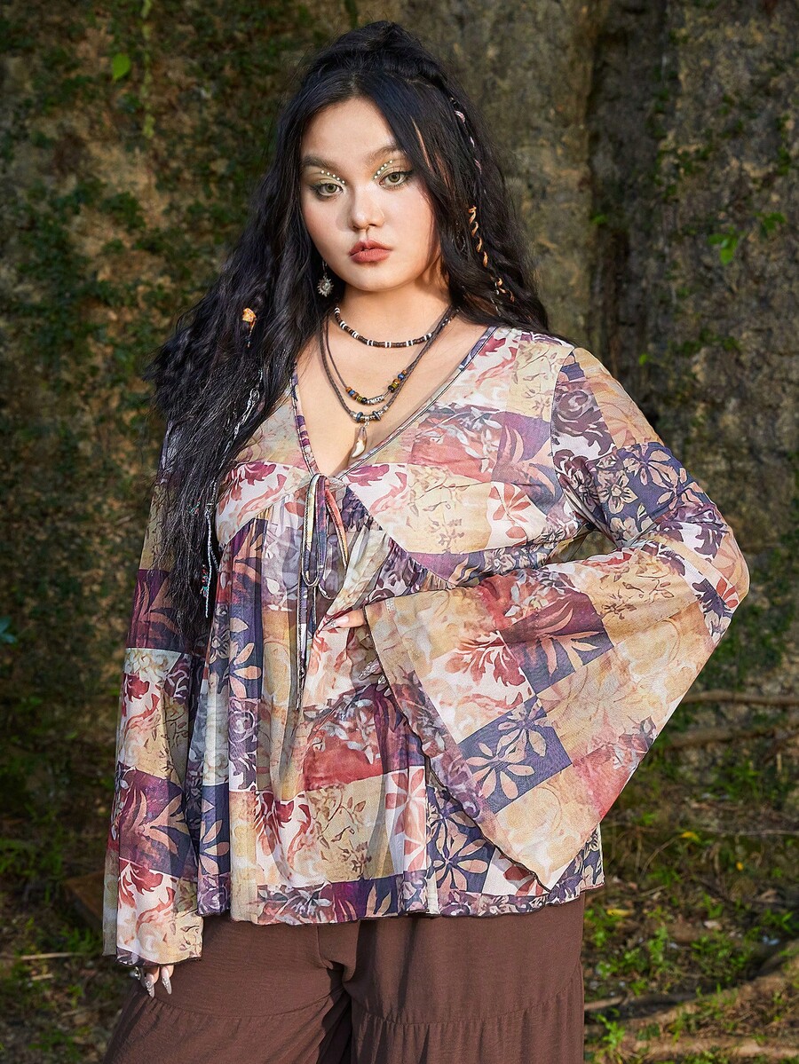 Hippie Plus Patchwork Print Knot Front Bell Sleeve Peplum Top