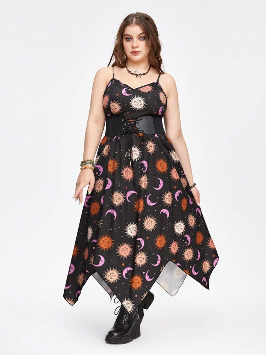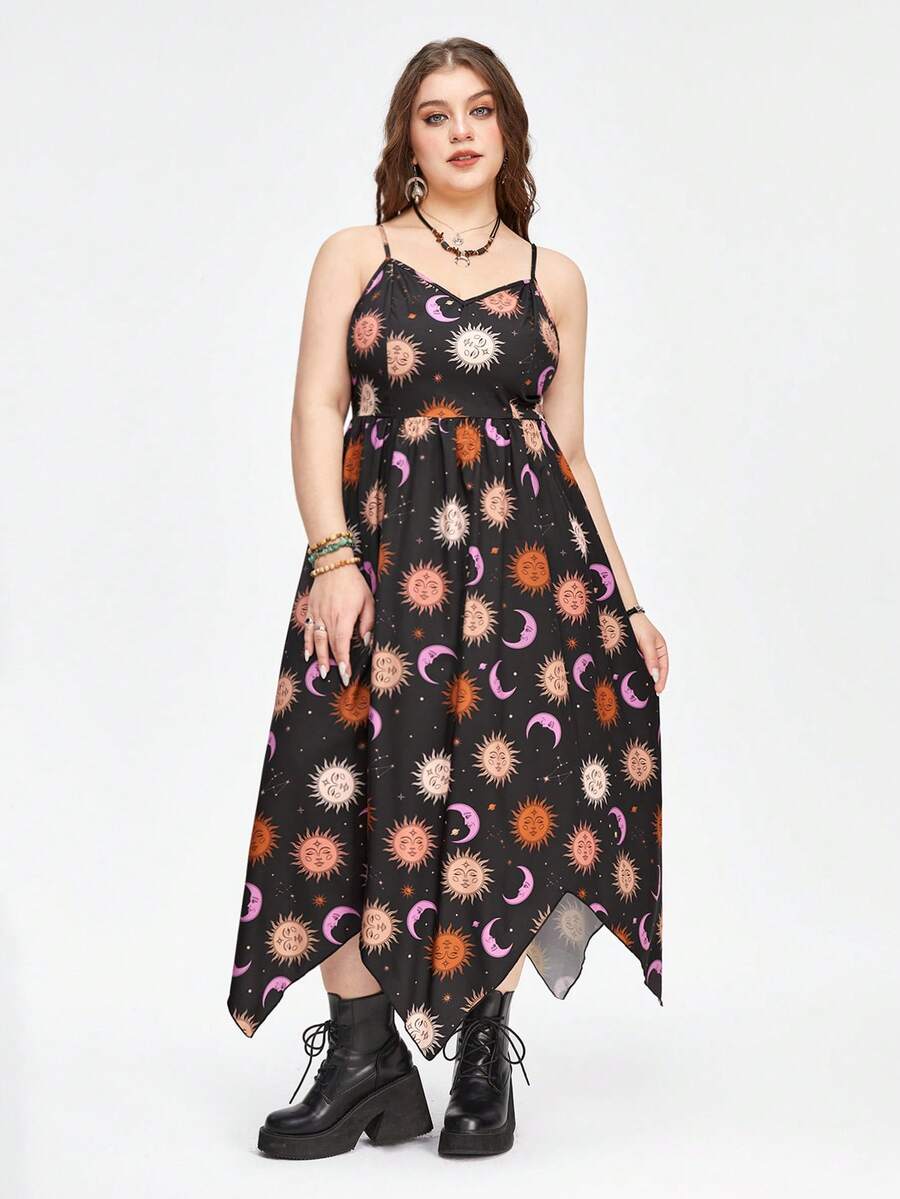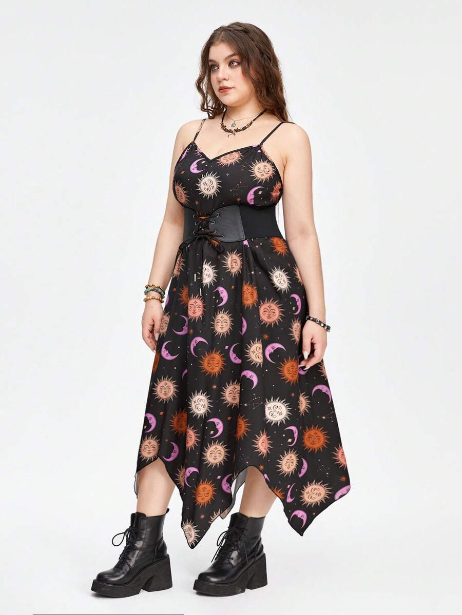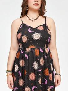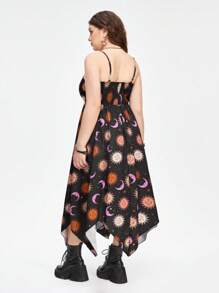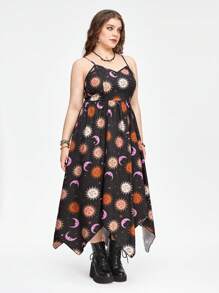 Hippie Plus Size Bohemian Sun, Moon, Stars Print Asymmetrical Hem Long Dress