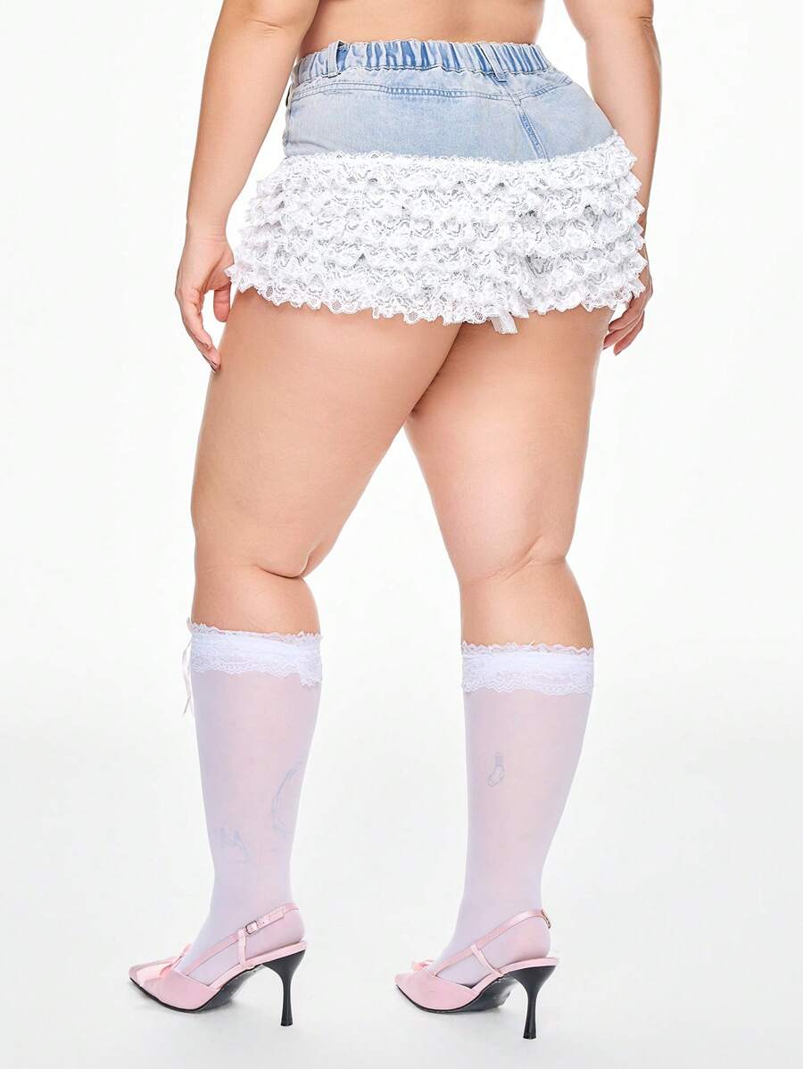 Hippie Plus Size Women's Cute & Sweet Multi-Layer Lace Decor Patchwork Denim Shorts