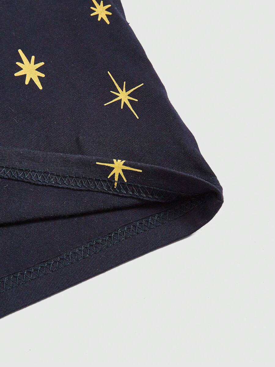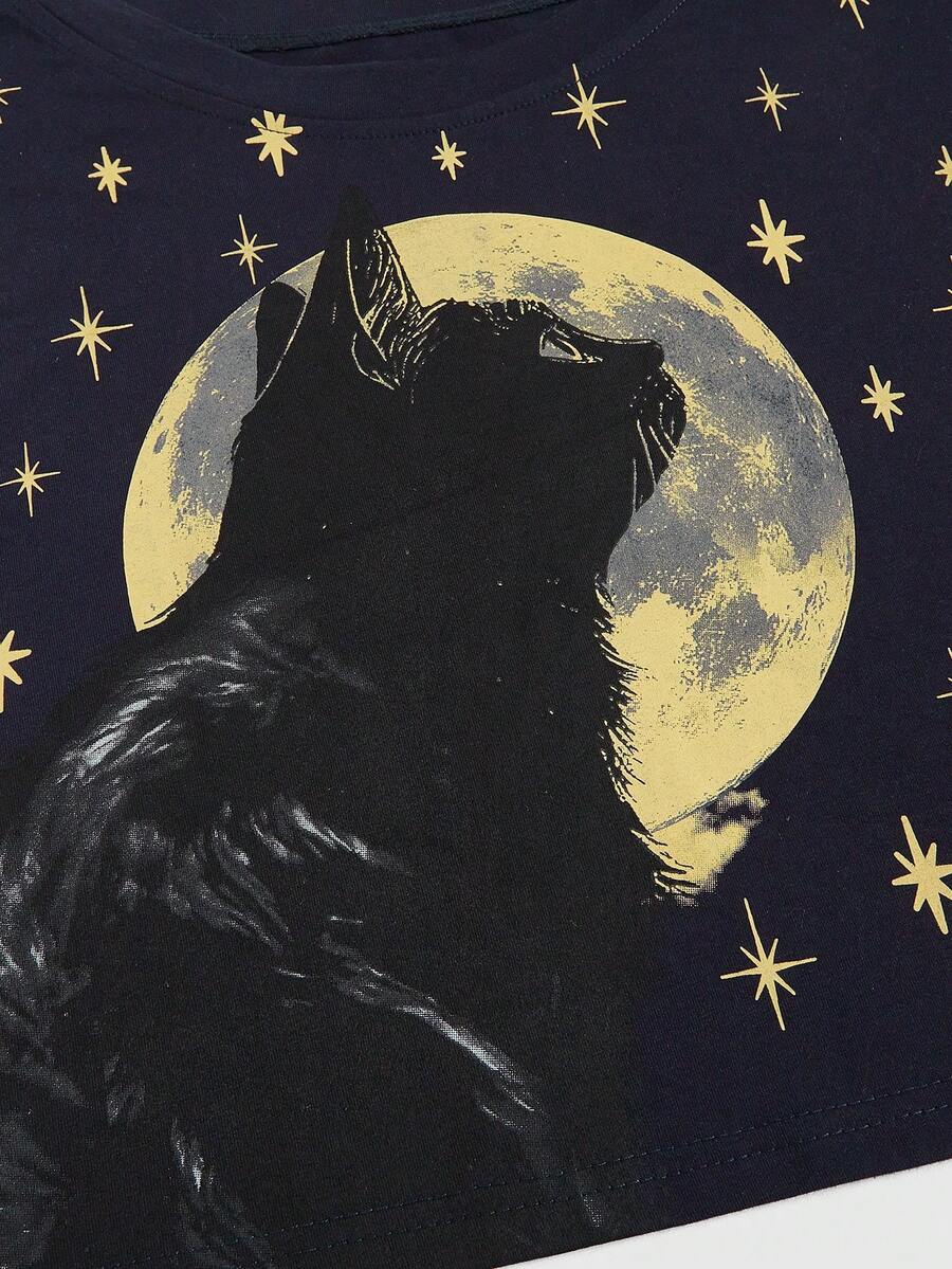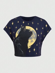 Hippie Sun, Moon, Stars And Cats Print Batwing Sleeve Cropped T-Shirt