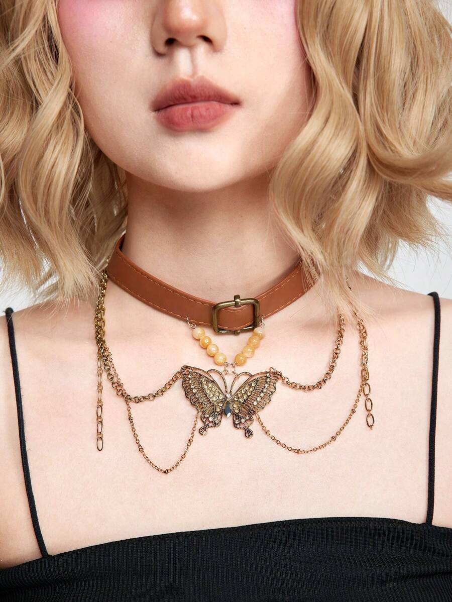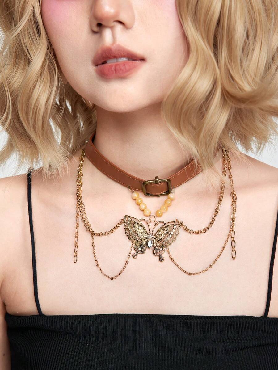 Hippie Vintage Heavy Duty Butterfly & Leather Jointed Collarbone Chain, Fashionable And Versatile Style
