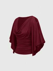 Hippie Vintage Loose Cold Shoulder Wooden Bead Decor Scoop Neck Cinched Waist Batwing Sleeve Women T-Shirt
