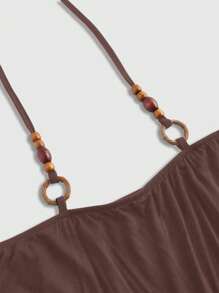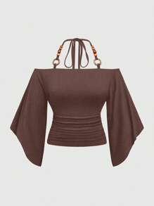 Hippie Vintage Loose Off Shoulder Wooden Bead Decor Batwing Sleeve Plus Size Women T-Shirt