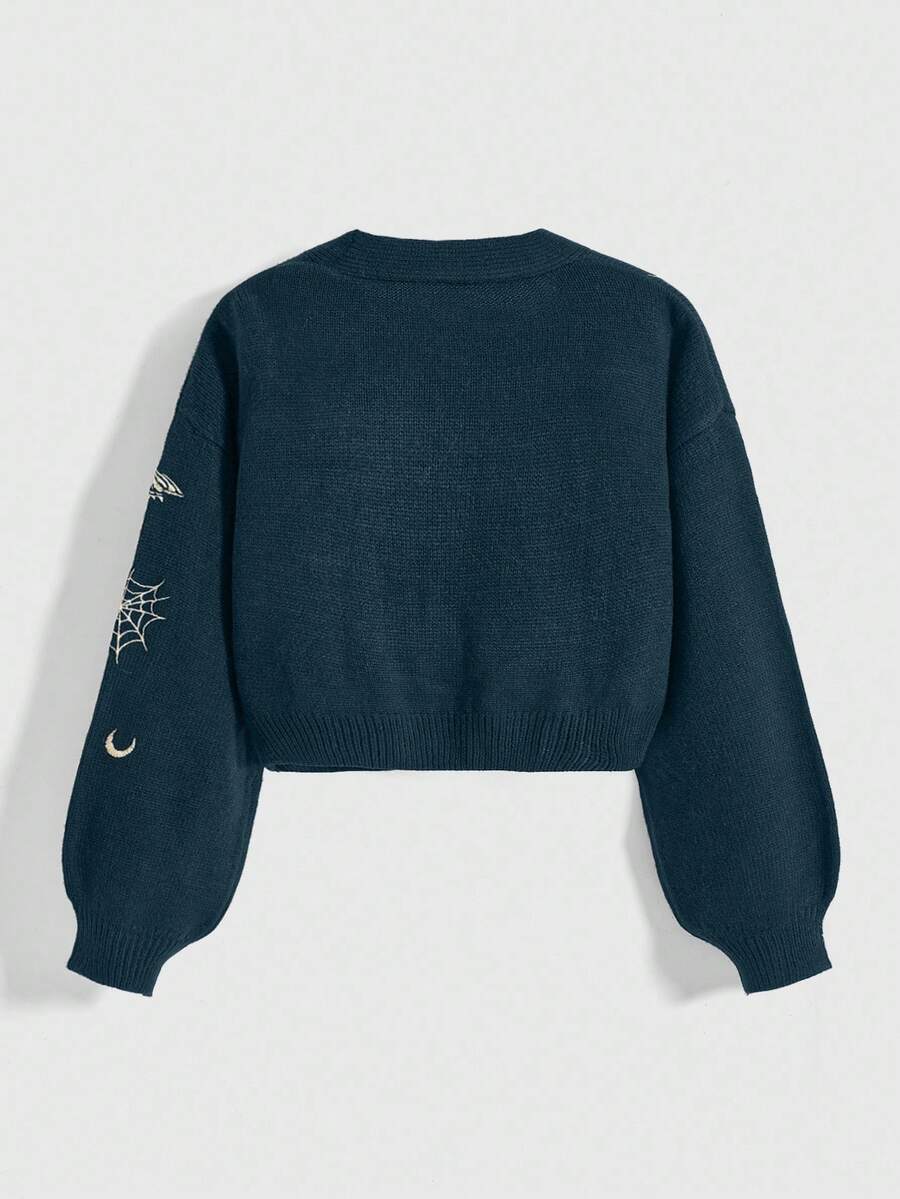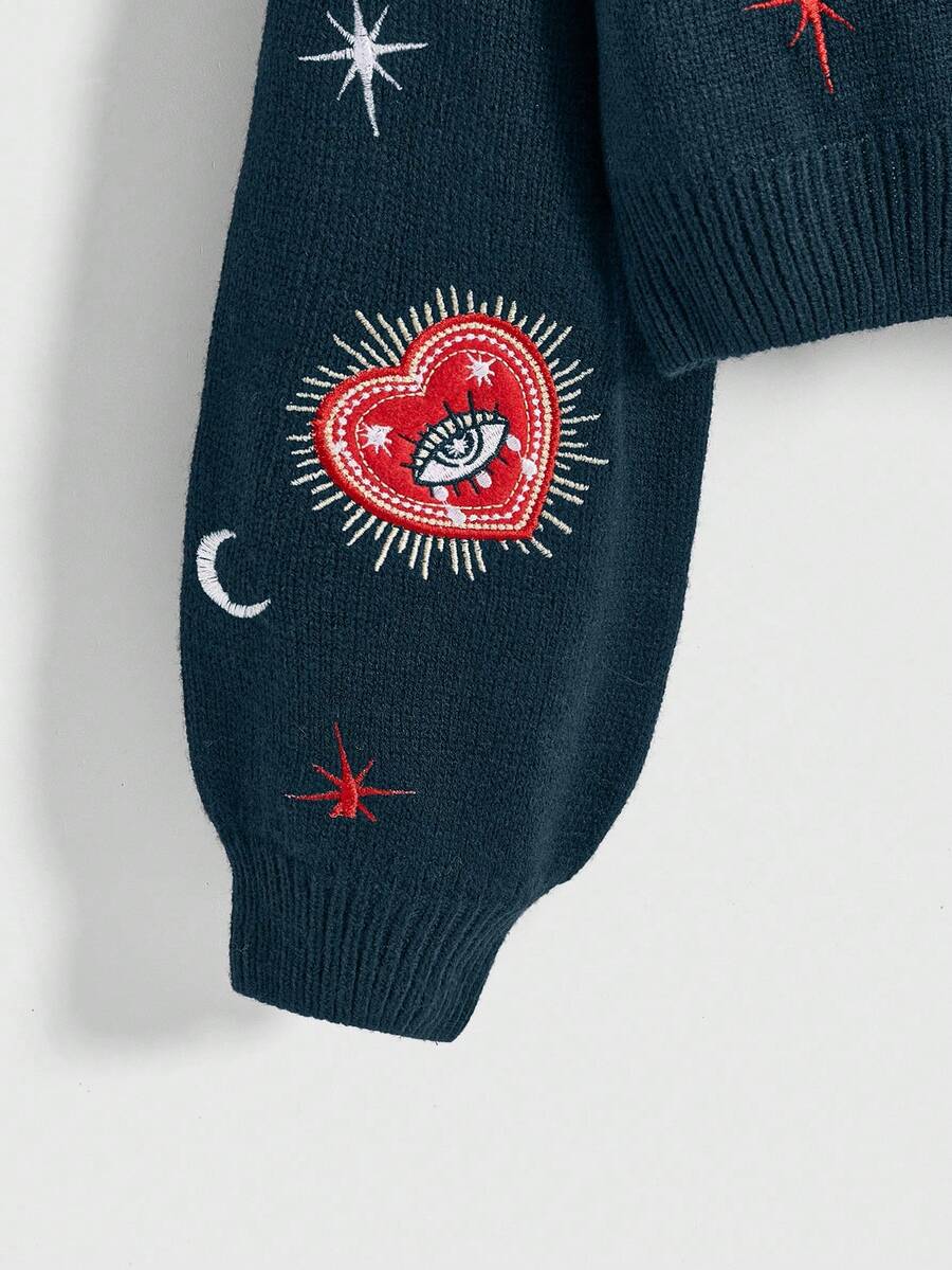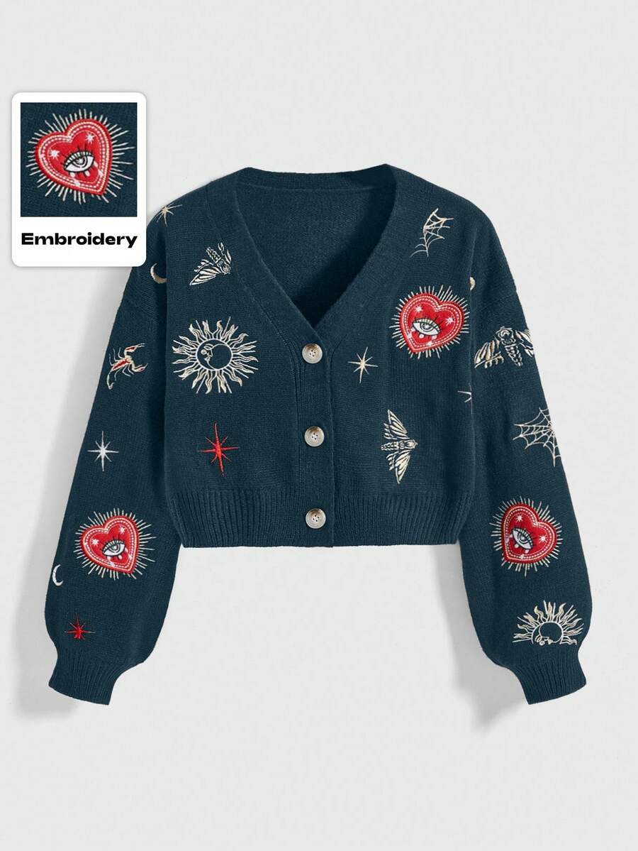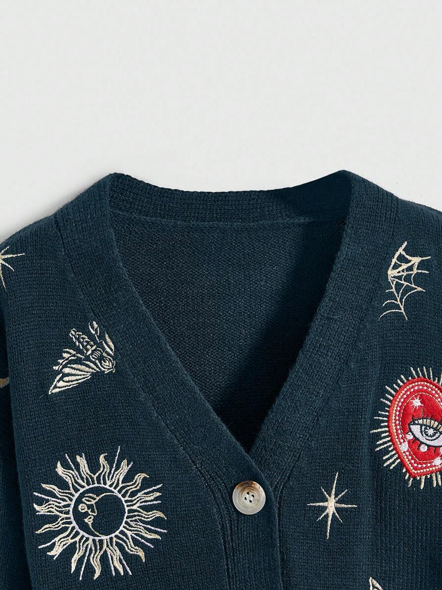 Hippie Vintage Palace Sun Moon Star Moth Embroidery V-Neck Plus Size Cardigan, Plus Size Black Knitted Cardigan, Delicate Embroidered Sweater, Plus Size Women Knitted Cardigan For Autumn/Winter