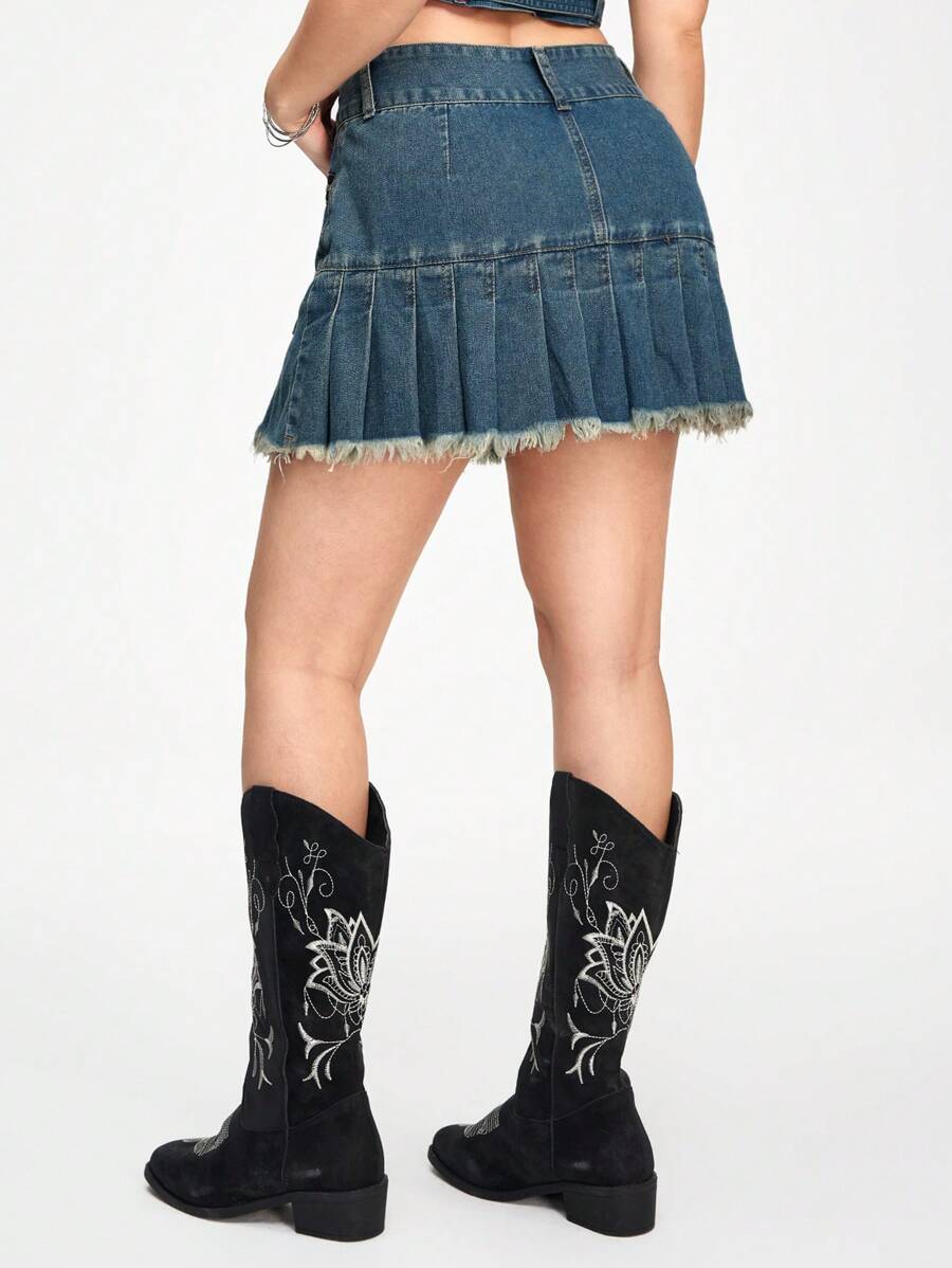 Hippie Women Casual Denim Skirt With Pleats And Frayed Edges For Summer
