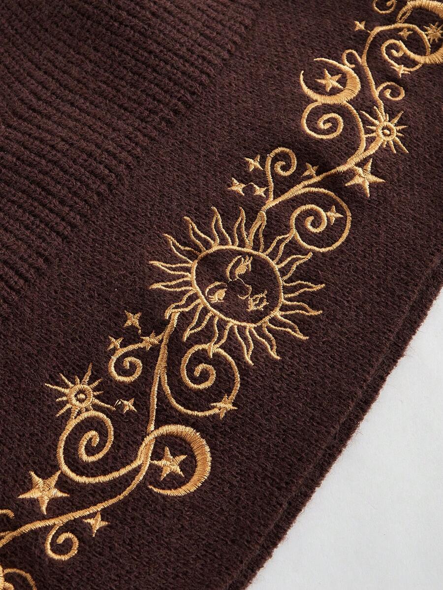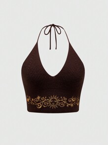 Hippie Women Knitted Top With Sun & Human Face Print Halter Neck Strap