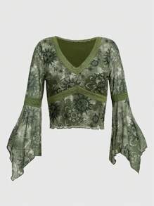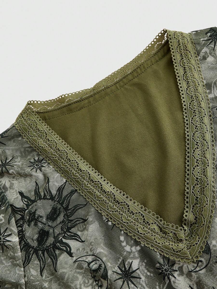 Hippie Women'S Lunar & Starry Print Lace Patchwork Bell Sleeve Top