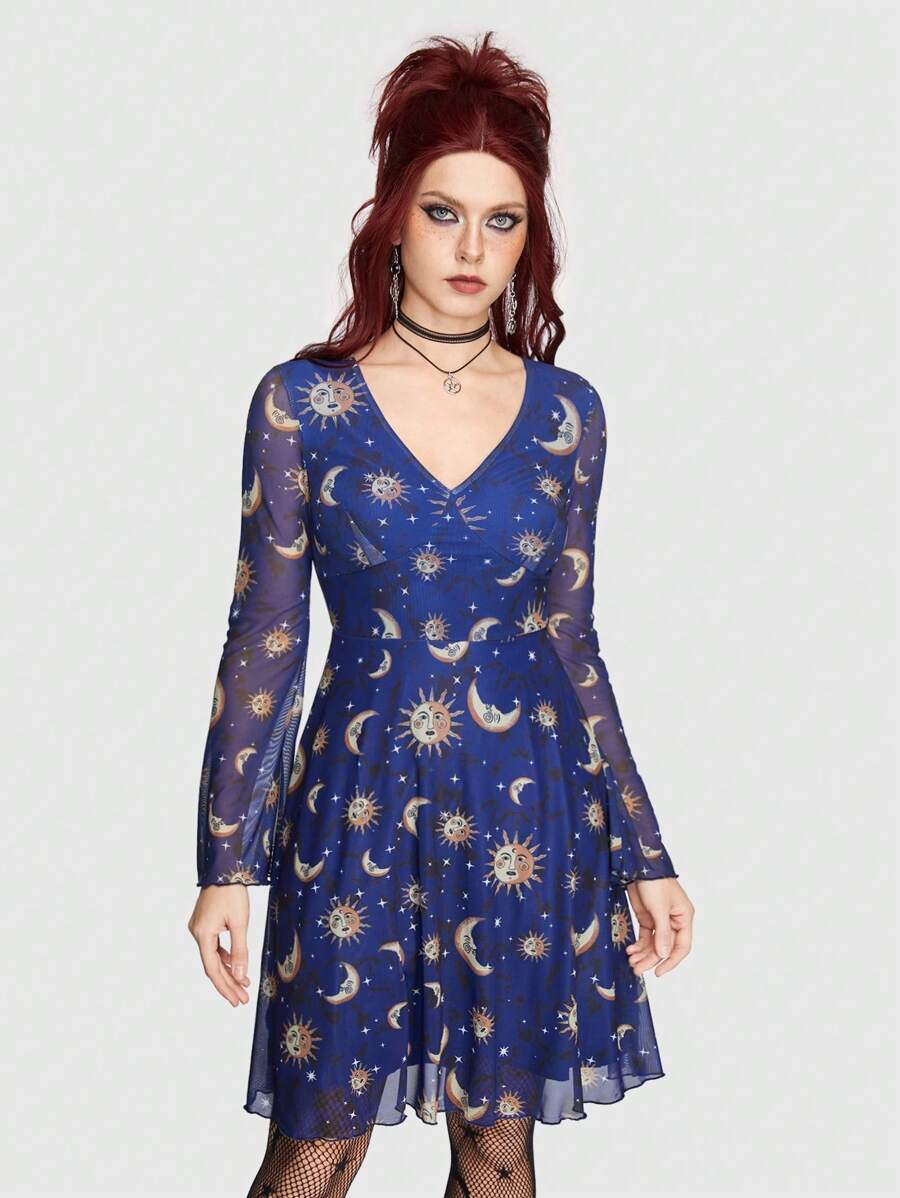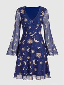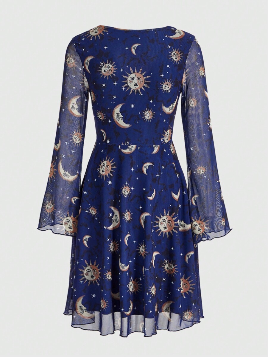 Hippie Women'S Mesh Flare Sleeve Dress With Sun, Moon And Star Pattern