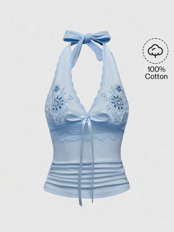 Hippie Women's Floral Print Contrast Lace Bodycon Halter Neck Camisole