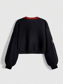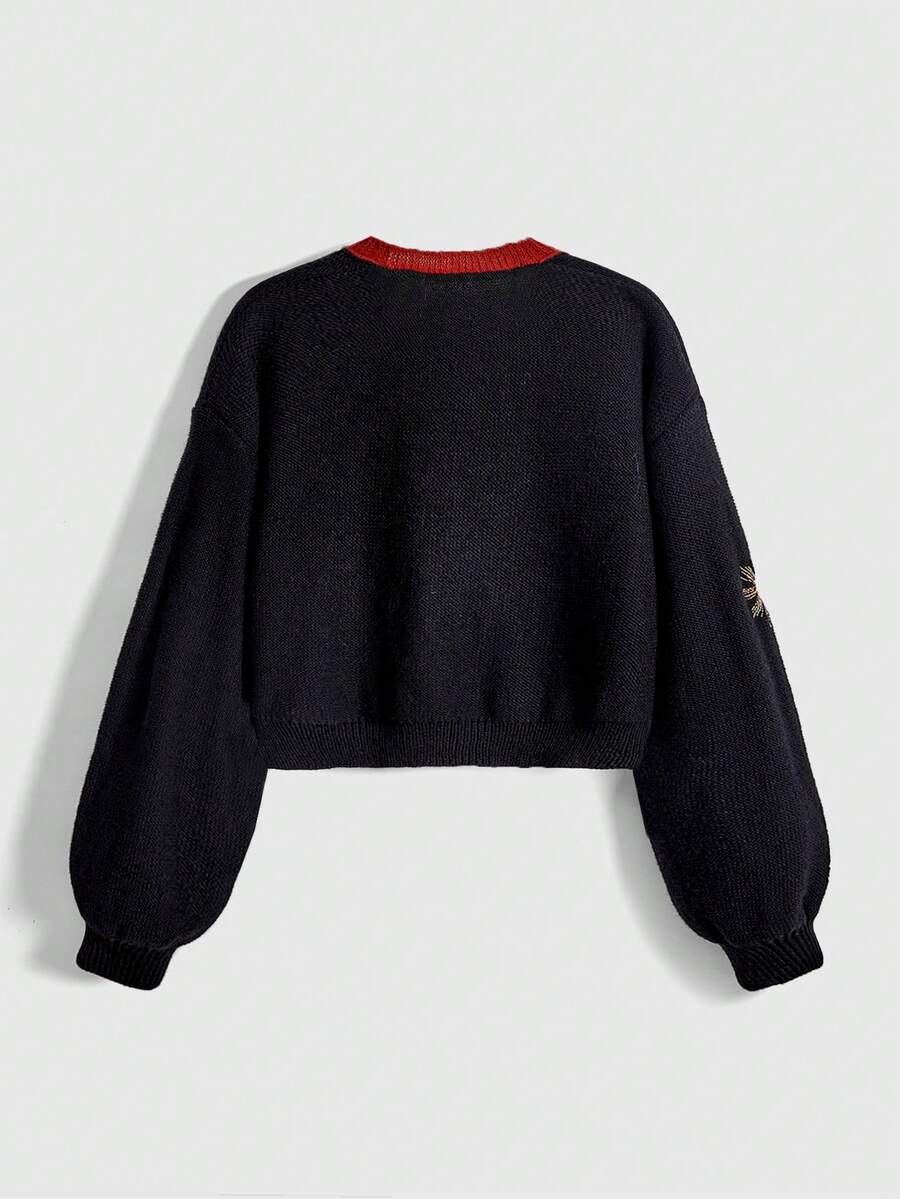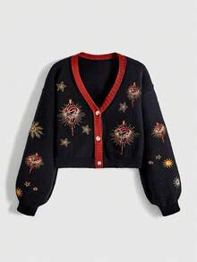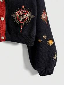 Hippie Women's Gothic Mysterious Witch Style Sun, Moon, Star, Palace, Heart, Eye Embroidery Contrast Color Knitted Cardigan