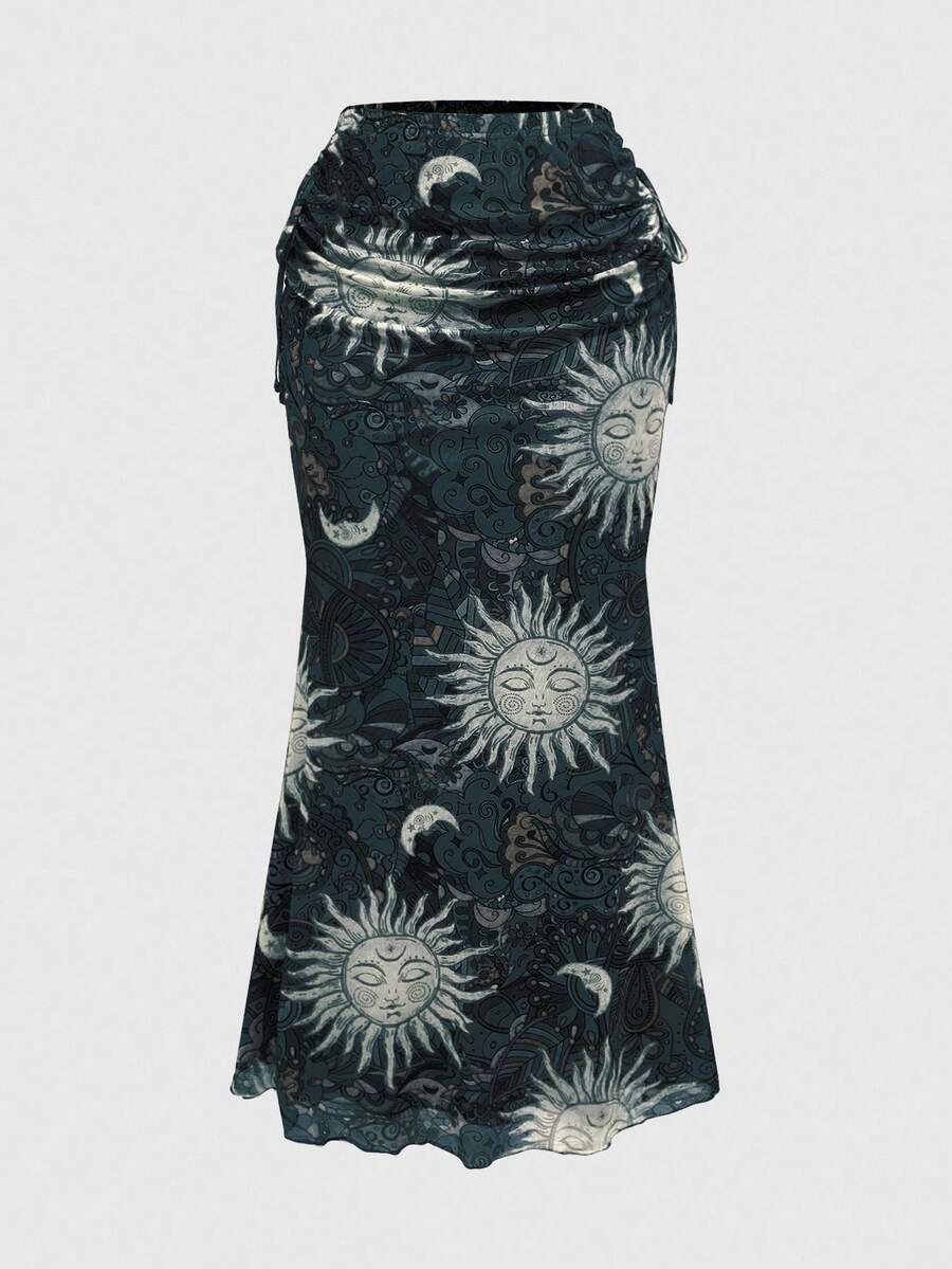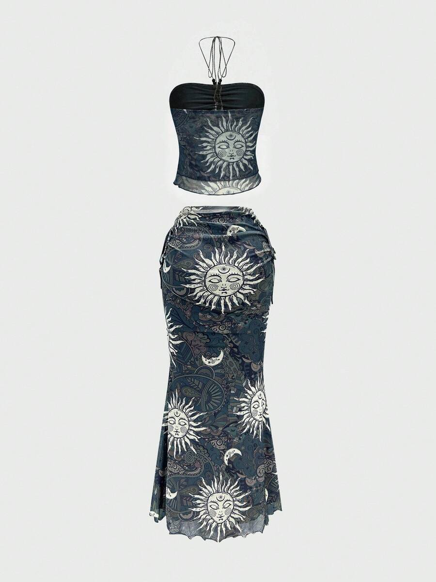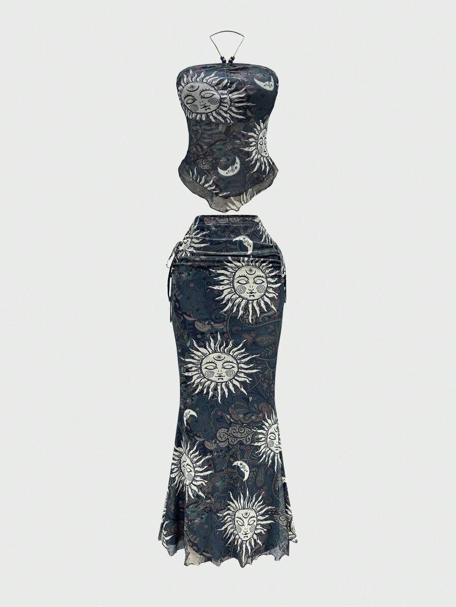 Hippie Y2K Celestial Motif Allover Print Top And Mini Skirt 2 Pieces Set For Women