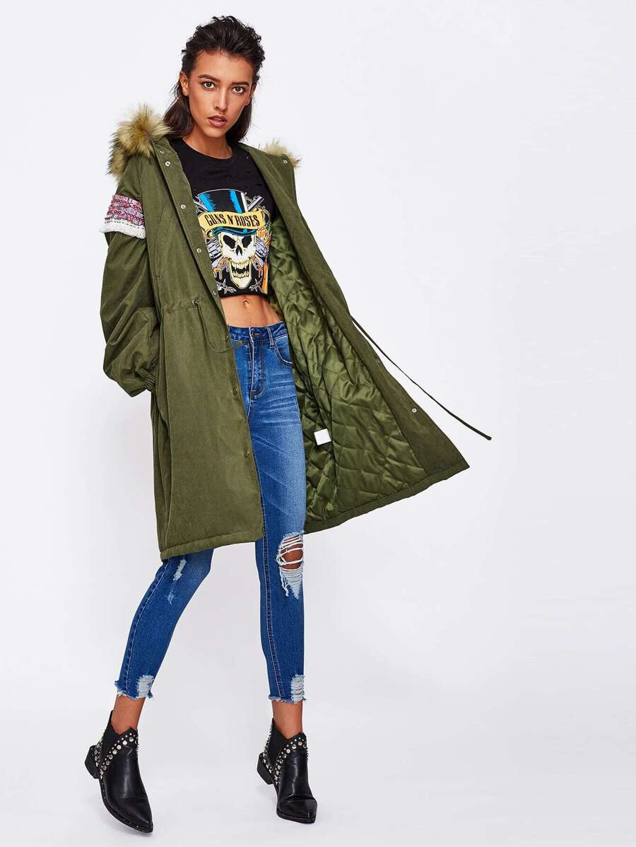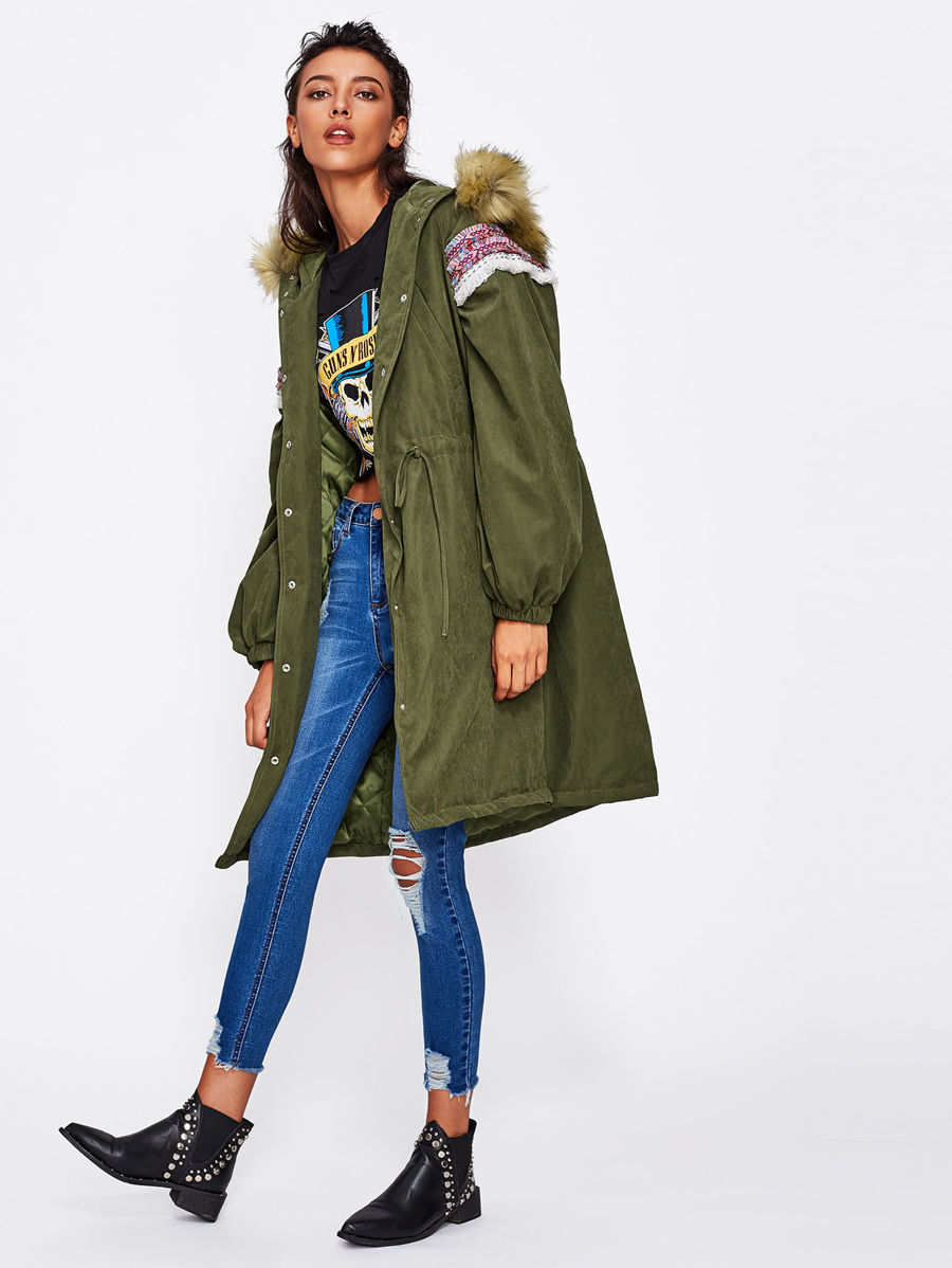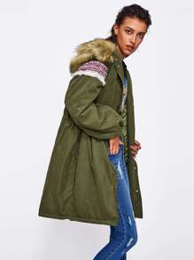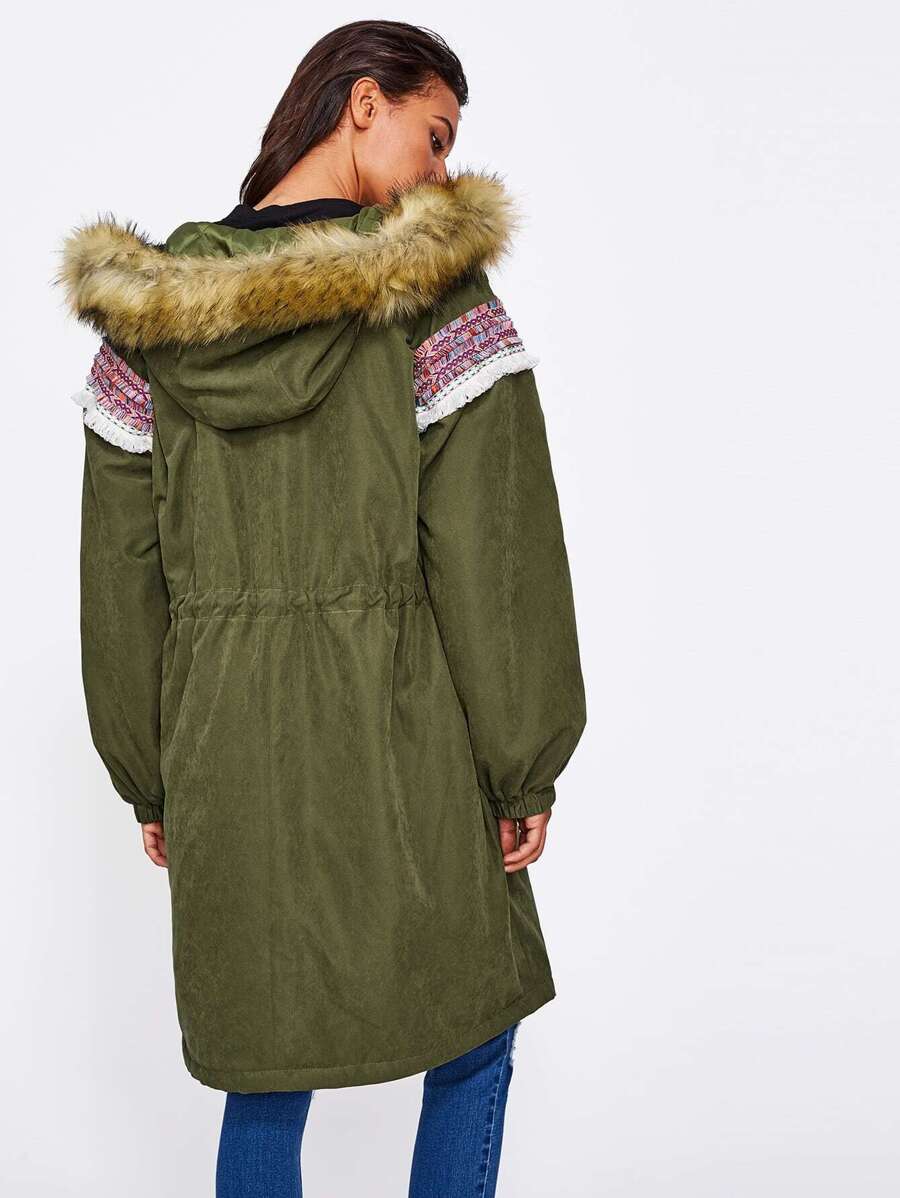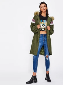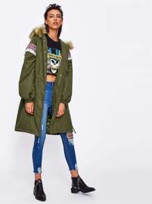 Hoodie Embroidered Tape Detail Parka Coat