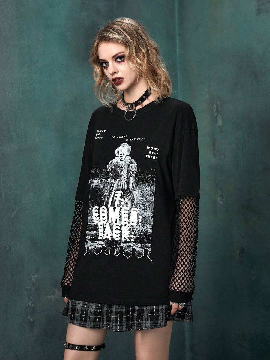 IT Chapter Two | ROMWE Figure Graphic Contrast Fishnet Tee