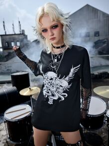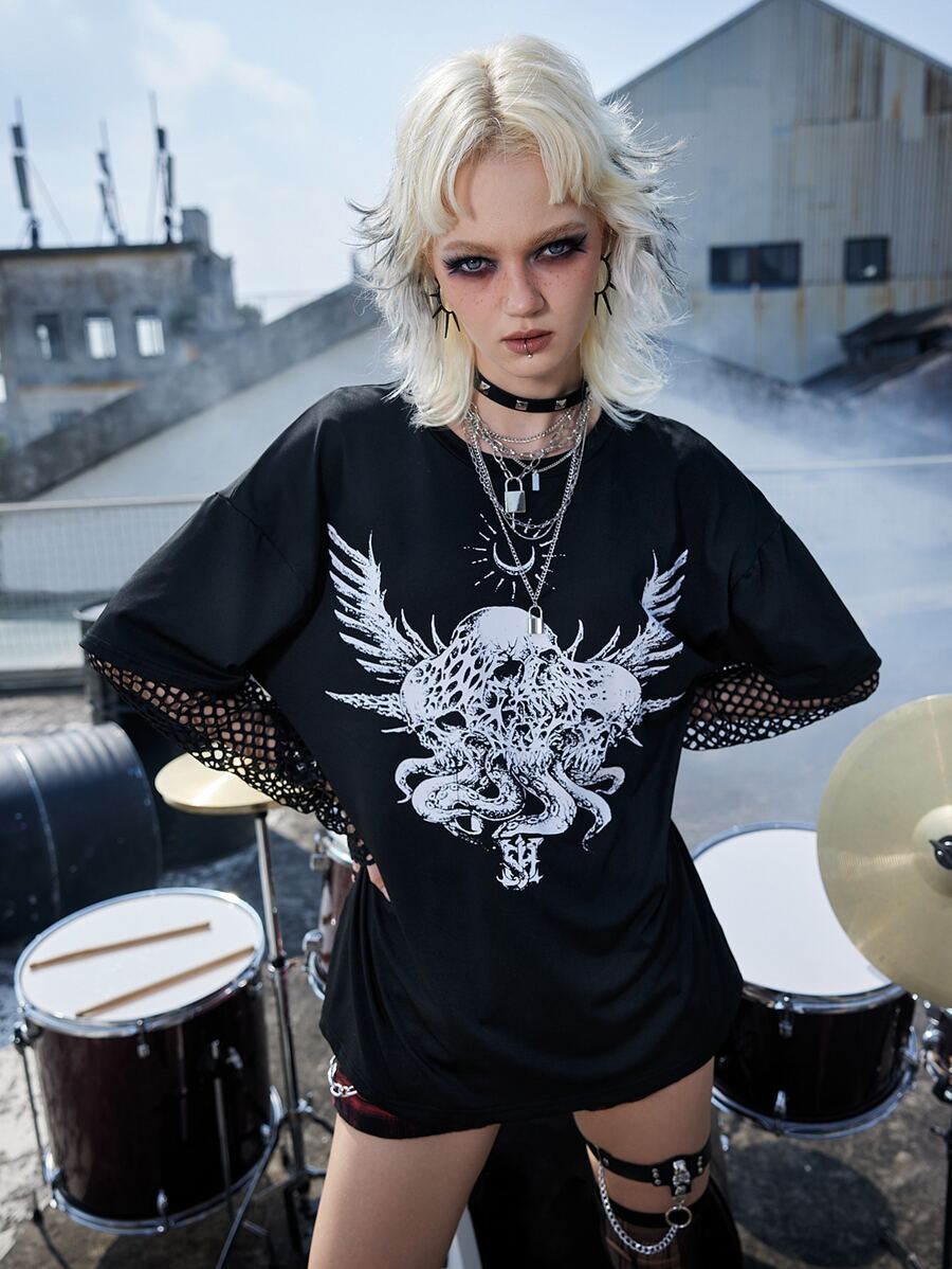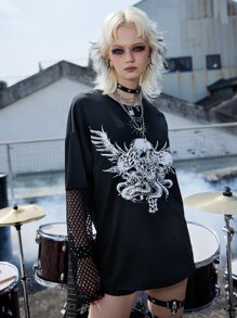 IamYouth 2 In 1 Skull & Wings Print Fishnet Drop Shoulder Tee