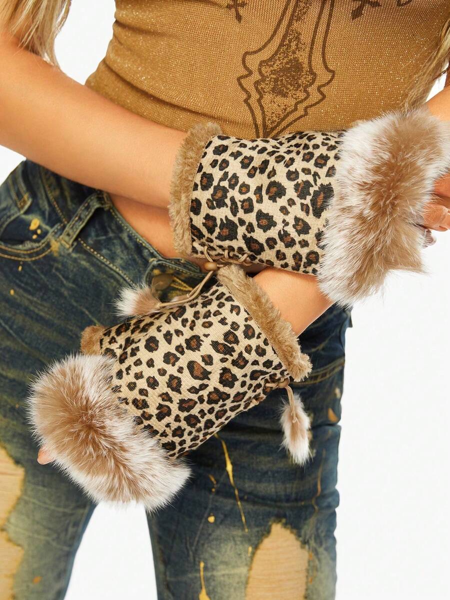 J-Fashion 1 Pair Punk Style Leopard Fluffy Gloves, Y2K Fuzzy Warm Gloves For Winter