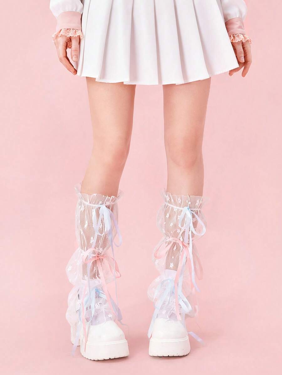 J-Fashion 1pair Colorful Ribbon Bow Lace Thigh High Socks For Women