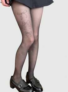 J-Fashion 1pair Women's Black Stockings With Three Bows, Tattoo & Print Design, All Seasons