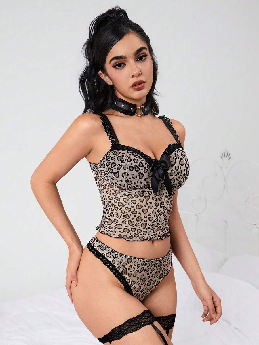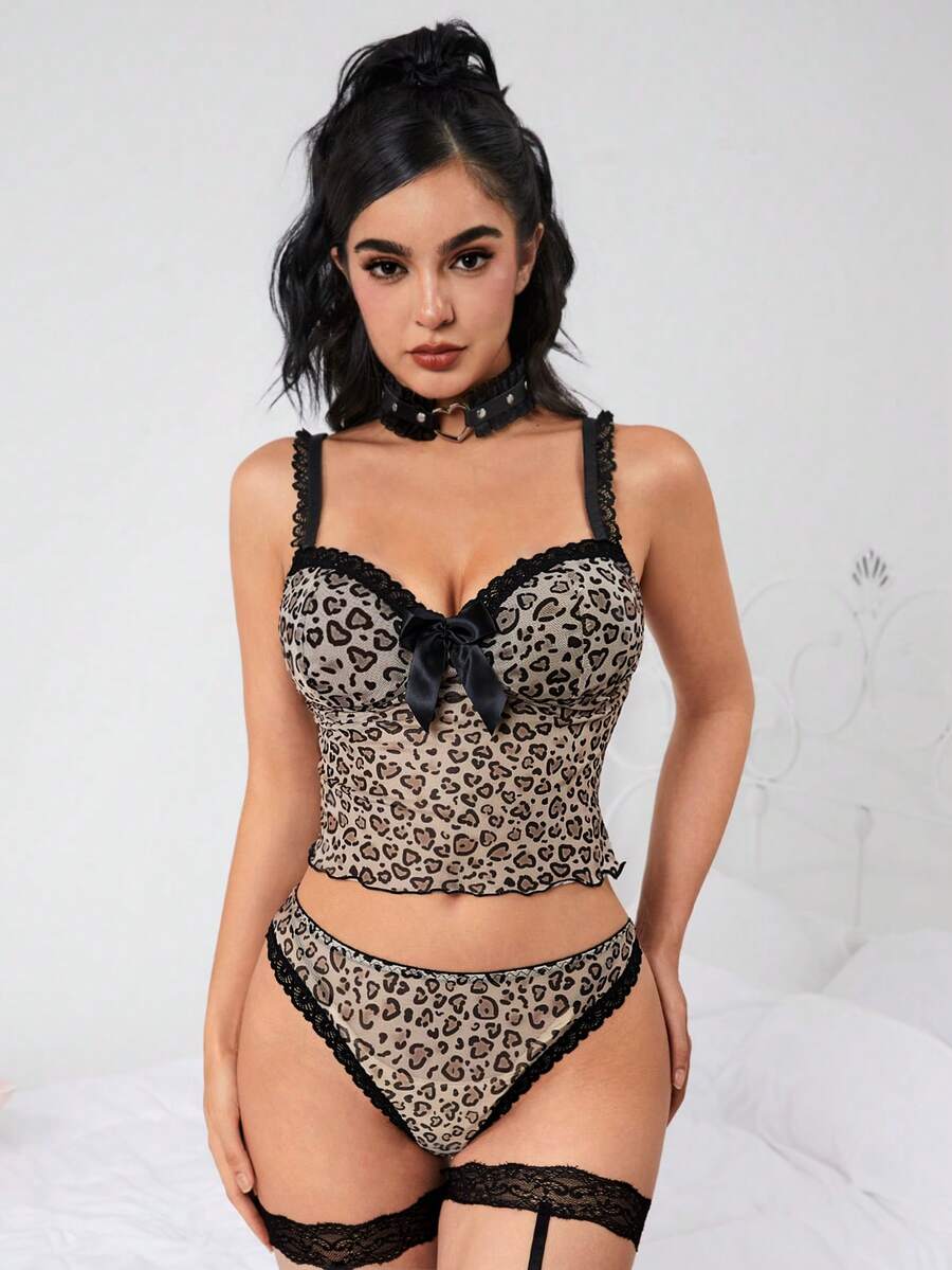 J-Fashion Classic Leopard Print Lace Spliced Bra & Panty Set For Teen Girls, Wire-Free