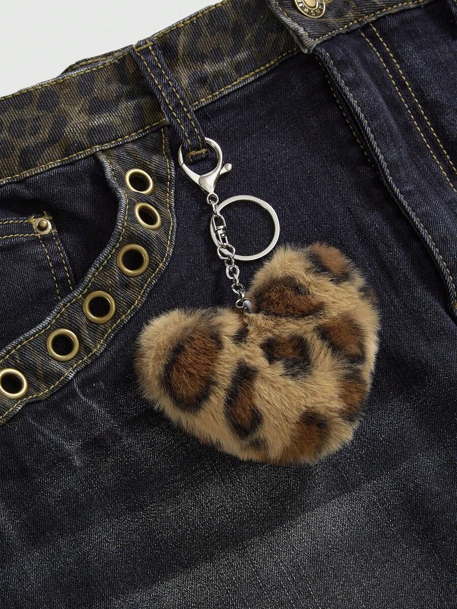 J-Fashion Plus Size Grunge Vintage Y2K Sexy Low Waist Leopard Patchwork Ripped Street Snap Button Chain Heart Leopard Denim Skirt