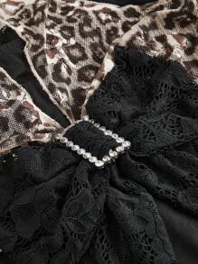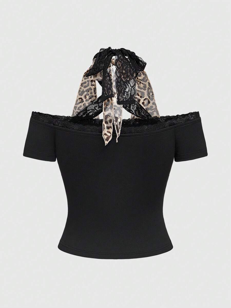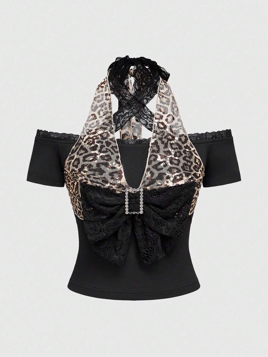 J-Fashion Plus Size Y2K Cheetah Print Halter Splice Bowknot 2 In 1 Cold Shoulder T-Shirt