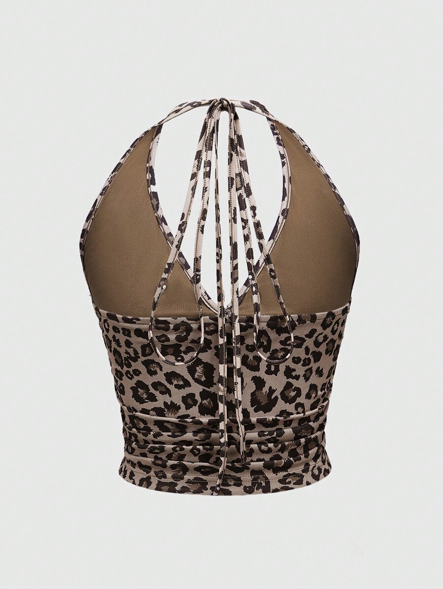 J-Fashion Sexy Leopard Print Pleated Halter Neck Crop Top And Mini Skirt Set