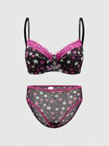 J-Fashion Shibuya Gal Five-Pointed Star & Lace Patchwork Sexy Mesh Lingerie Set