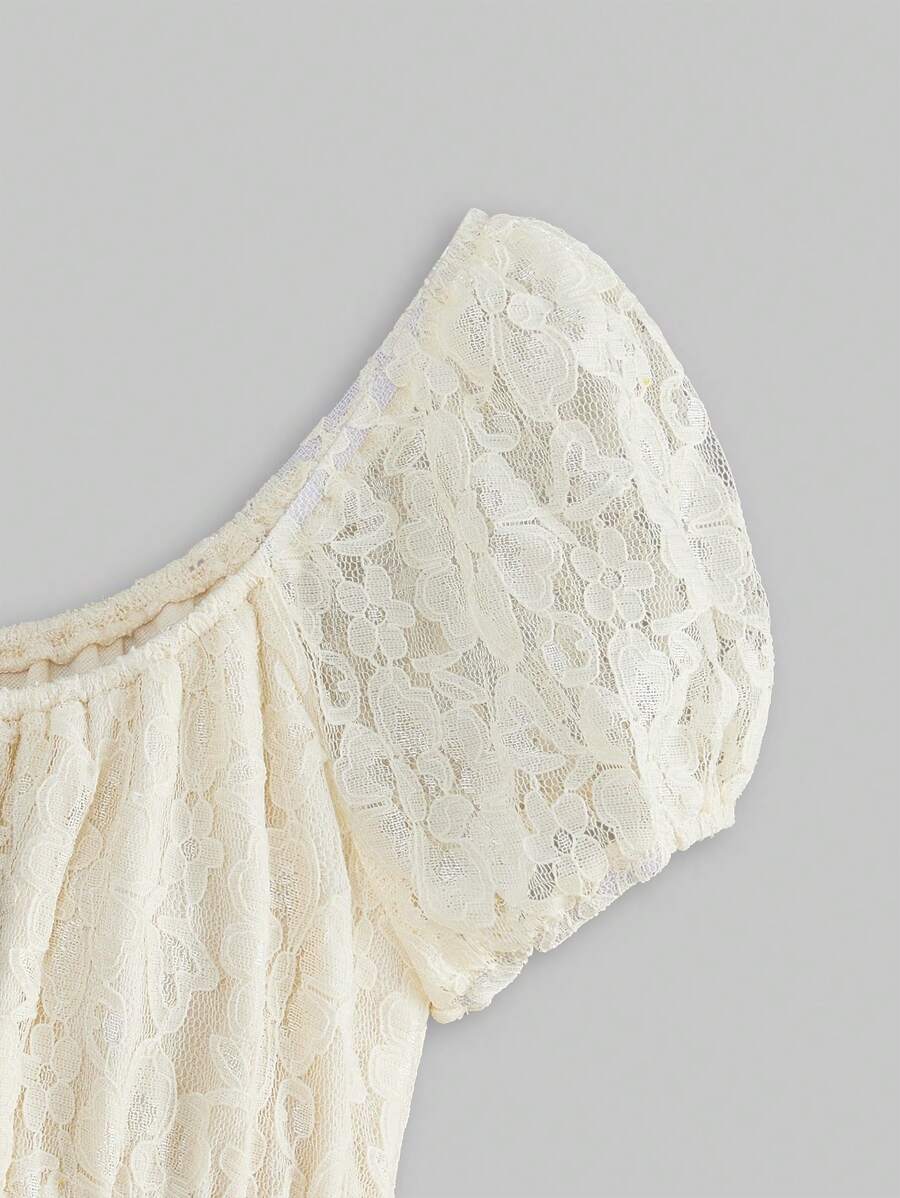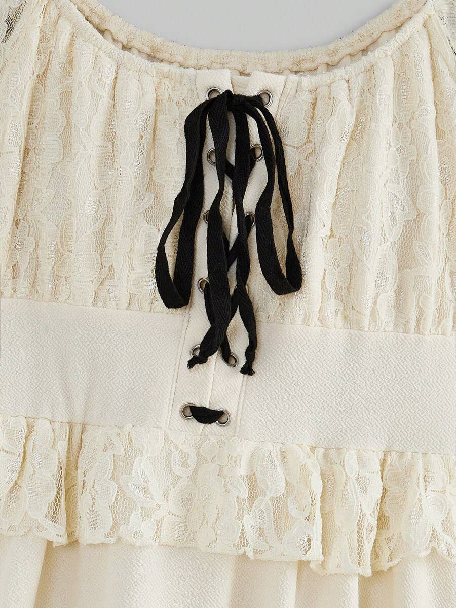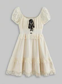J-Fashion Vintage Mori Style Puff Sleeve & Lace Splice Belted Dress For Women