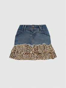 J-Fashion Women's Simple Daily Wear Denim Skirt, Color Block Leopard Print
